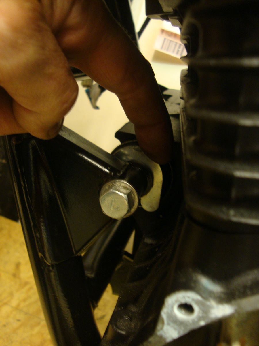 got them tightened up. A bit. Then we flipped the whole thing up the right way and I tweeked all the bolts again. Problem was,things didnt look right.The rear mount looked a bit twisted and the weird u-shaped washer/spacer thing on the front upper mount was very loose. So, I thought,Ok,Ill torque everything up as it should be and hopefully thatll be that.