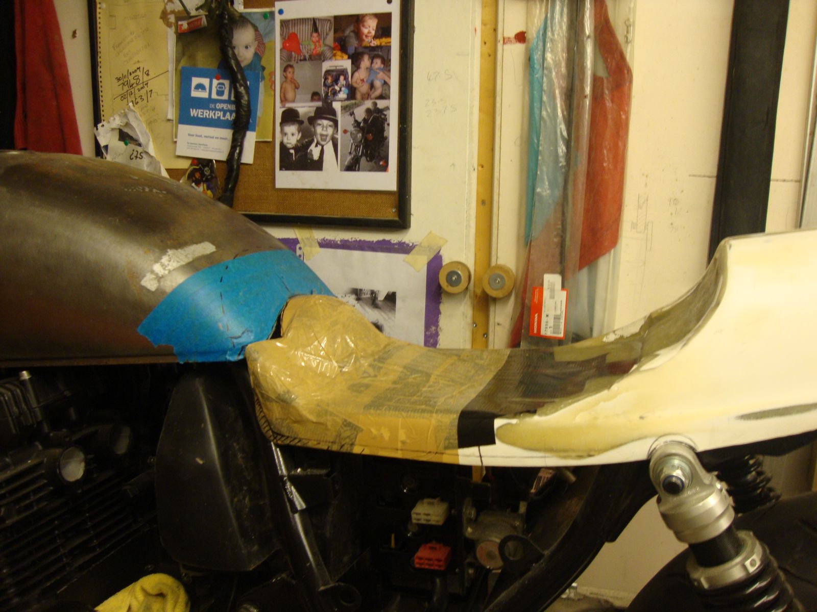 Still busy with the fiberglass. Waited all week to get a chance to continue. Took half an hour to lay some extra glass around the fork mount area,then I have to wait for it all to dry. This is a slow process. Back to it tomorrow. I thought it might be more time economical to do some other stuff at the same time. So, I started preparing for the seat pan.