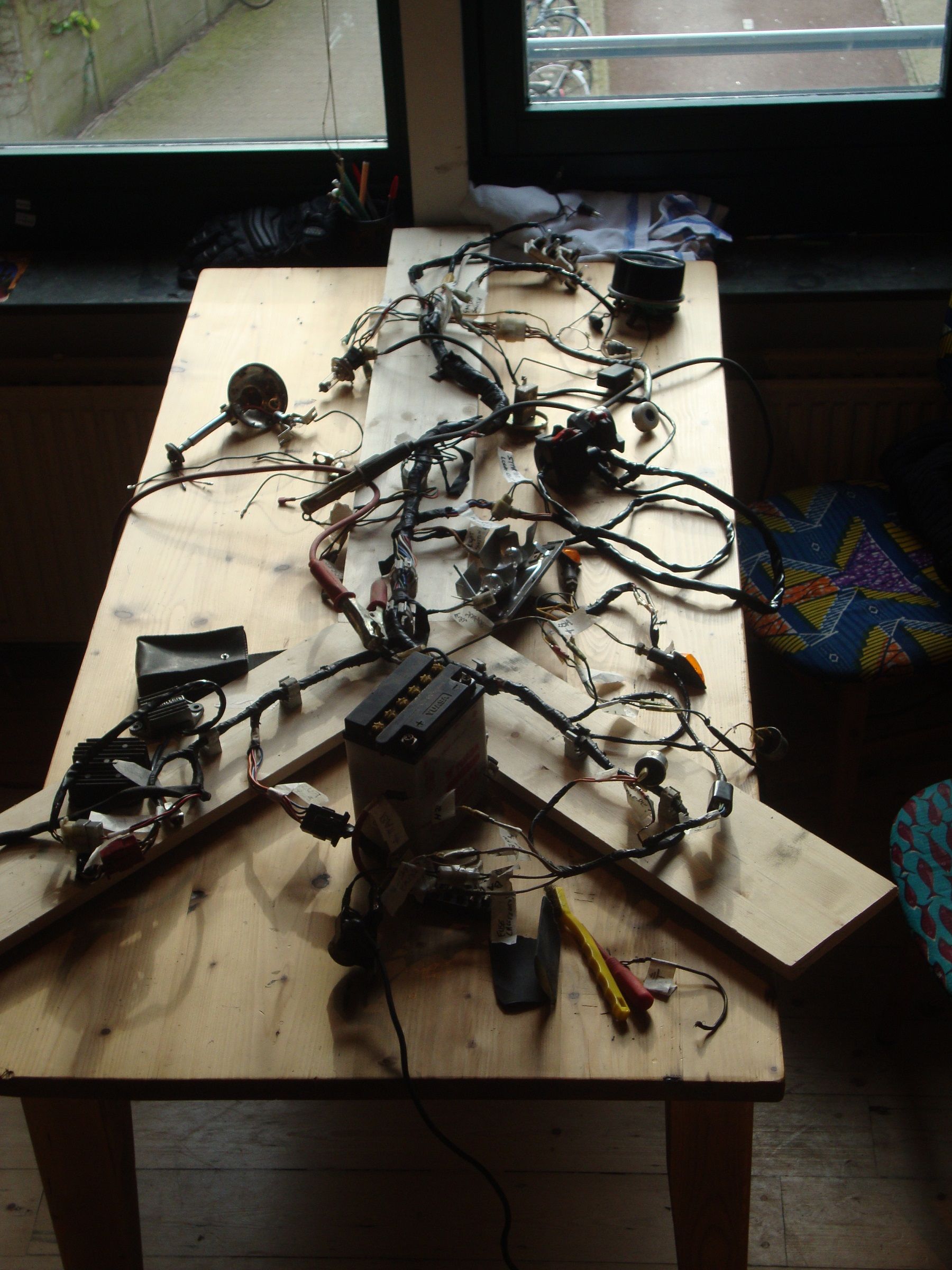 So, back to the loom. I gave the whole thing a good clean,got rid of 35 years worth of roadmuck. New fuses, battery charged and the (colour) schematic downloaded from a Kzrider.com.I got all the bits labeled and connected.Identified a few dodgy connections and patched them together for the bench test.
