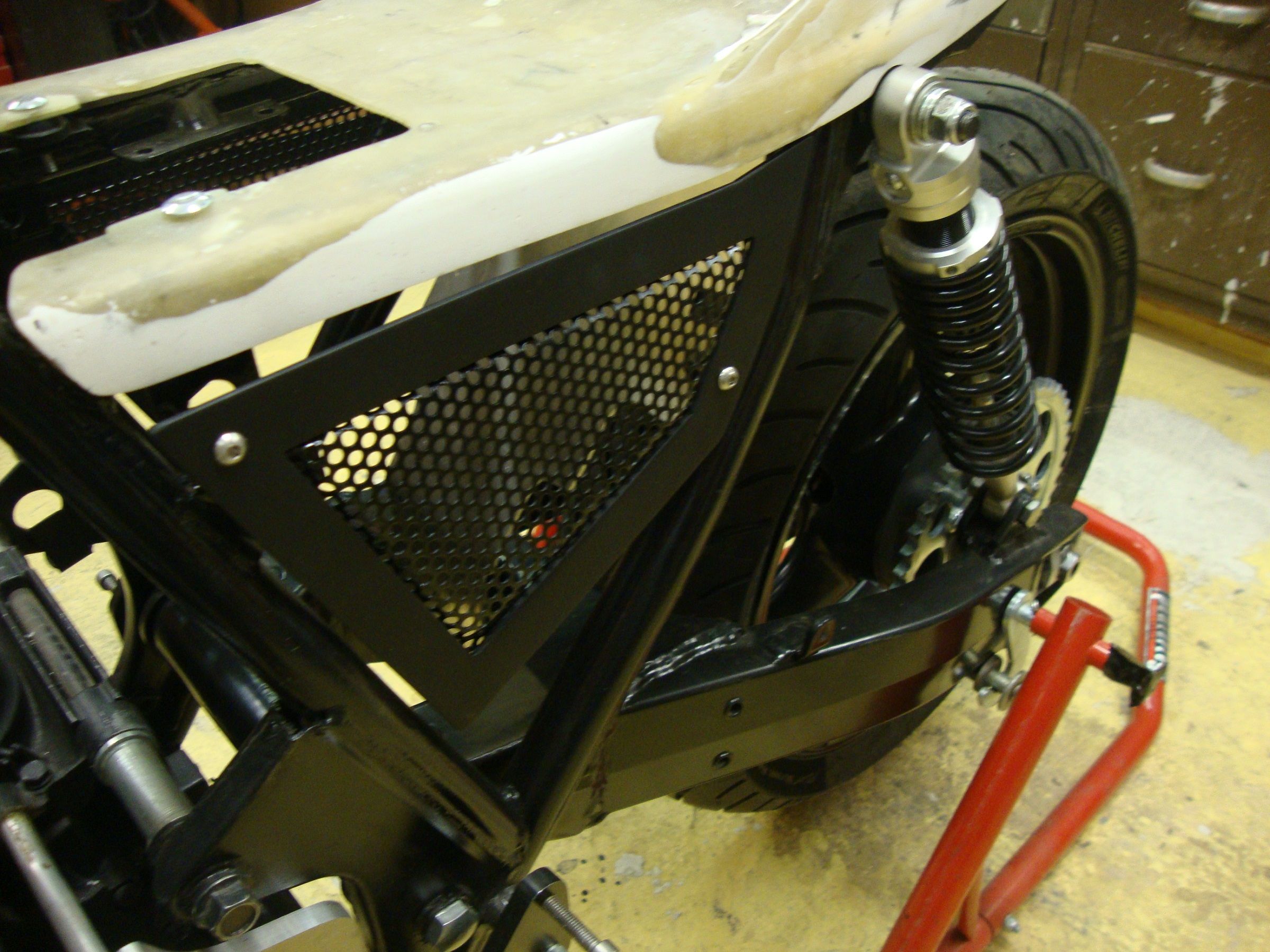 Yesterday was a frustrating day. I decided to do a bit of painting,,side stand,side panels and exhaust hanger.Everything went wrong. Patches,drips,bubbles. A real mess. Something that should have taken half an hour,now is going to take a few days. (drying,cleaning,repainting!!).