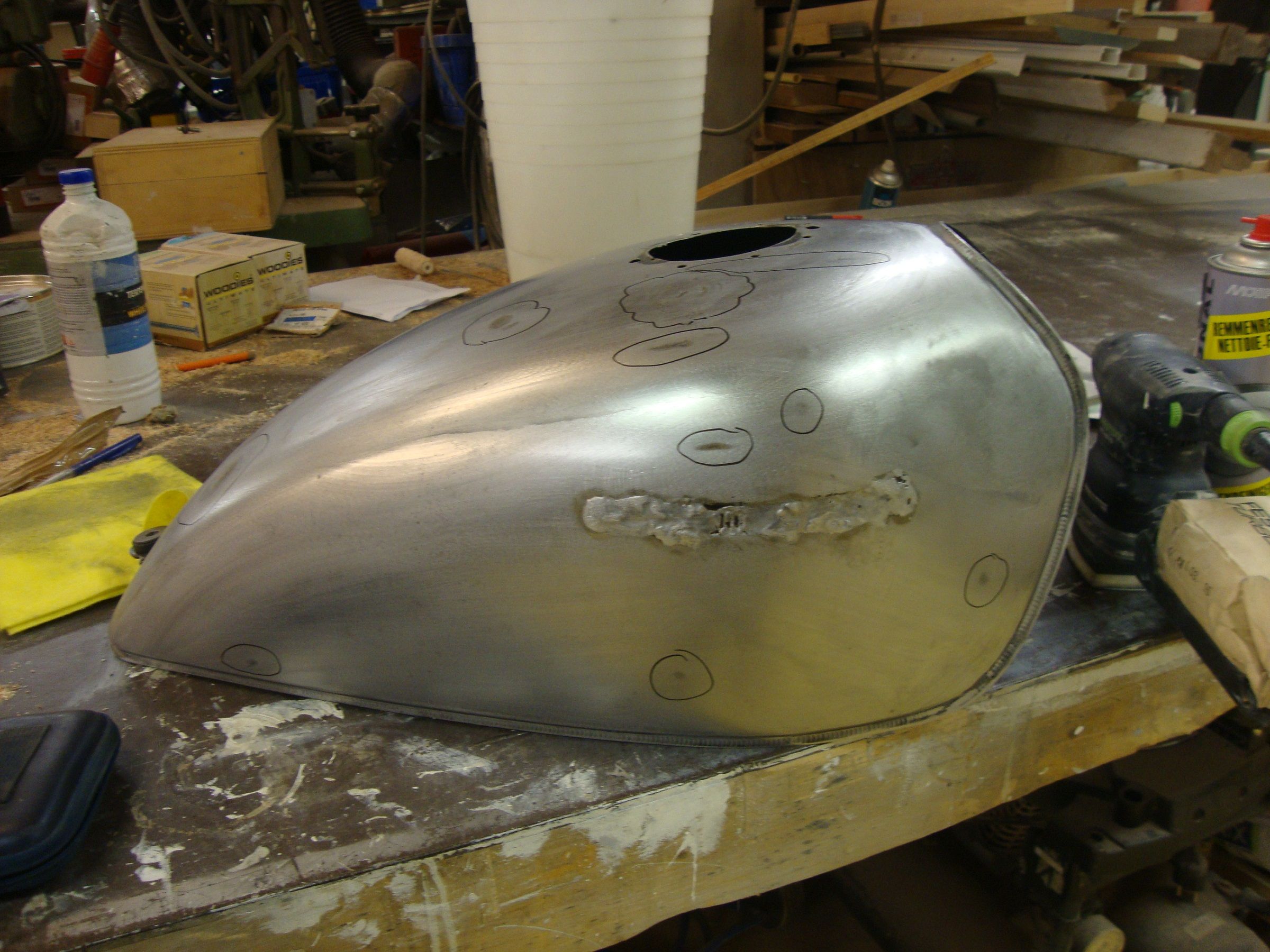 I was thinking about what to do with the hole and had in mind to cut out the area round the badges and get some new metal welded in. A bit extreme,I know but I really dont fancy the idea of tank sealer. Anyway,I went to the local bike shop to see if they knew of anyone that could weld it up for me and he said that I could just fill it with solder. Great. A diy fix. Cheap and cheerful. So,Im well happy about that.