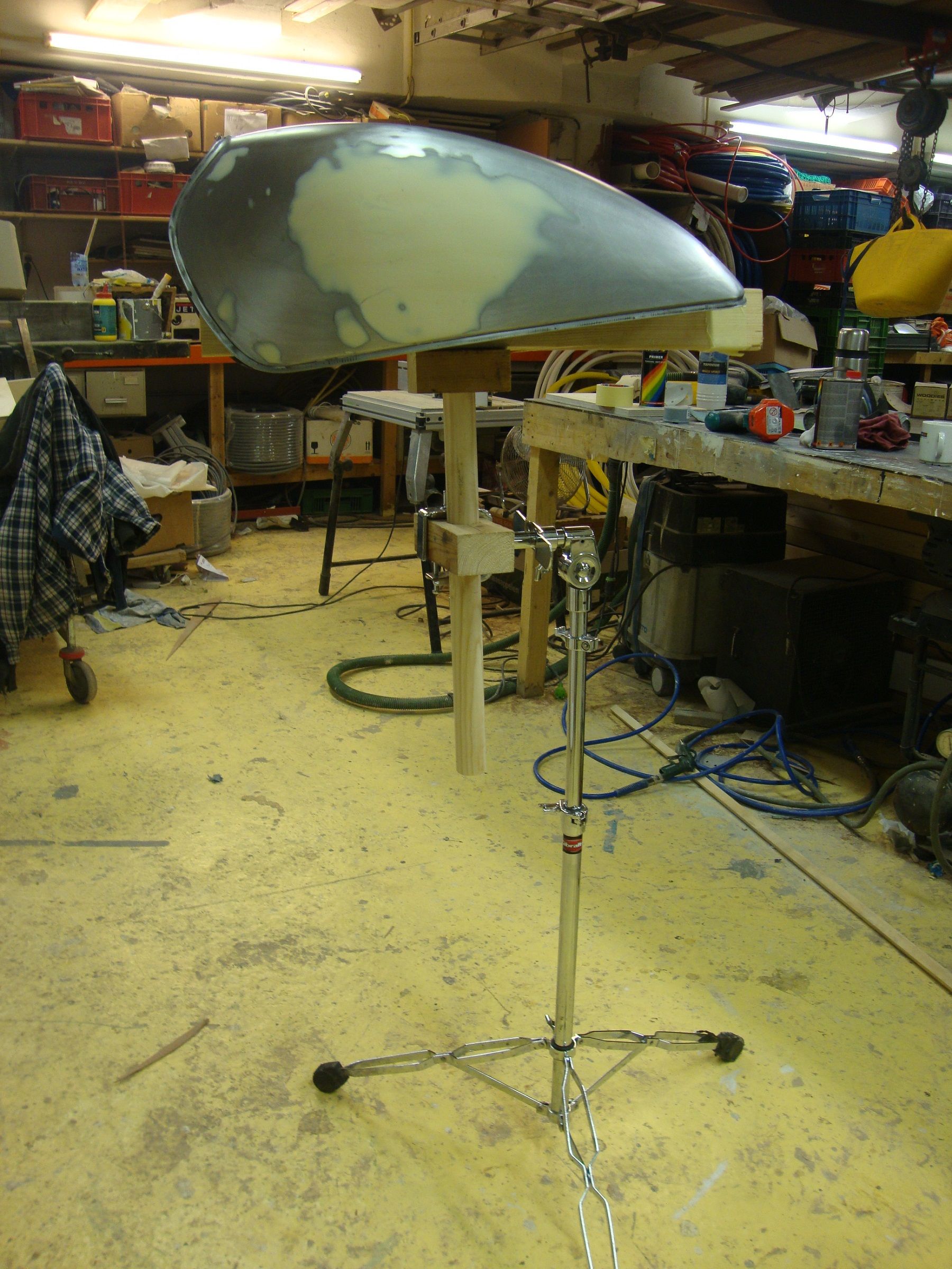 Not very beautiful but seems to have done the job. After that I went over it all with bodyfiller,there were also a lot of dents. Then I mounted it on my 'Neil Peart' signature tank painting stand.
