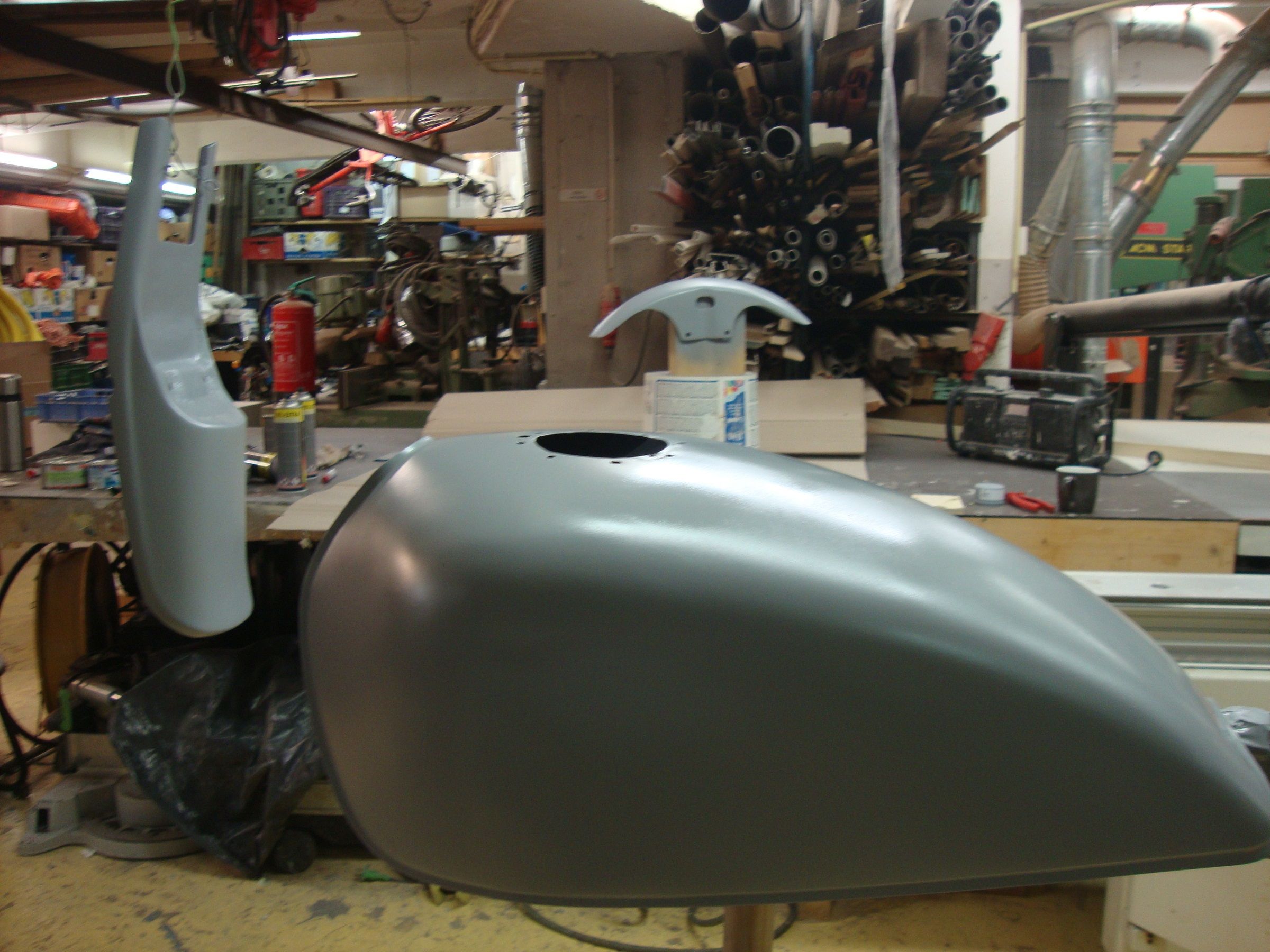 Today I struggled on with that and got nowhere so I had a go at the tank and plastics. Got everything sanded back, 2nd going over with the filler and a 2nd coat of primer on everything