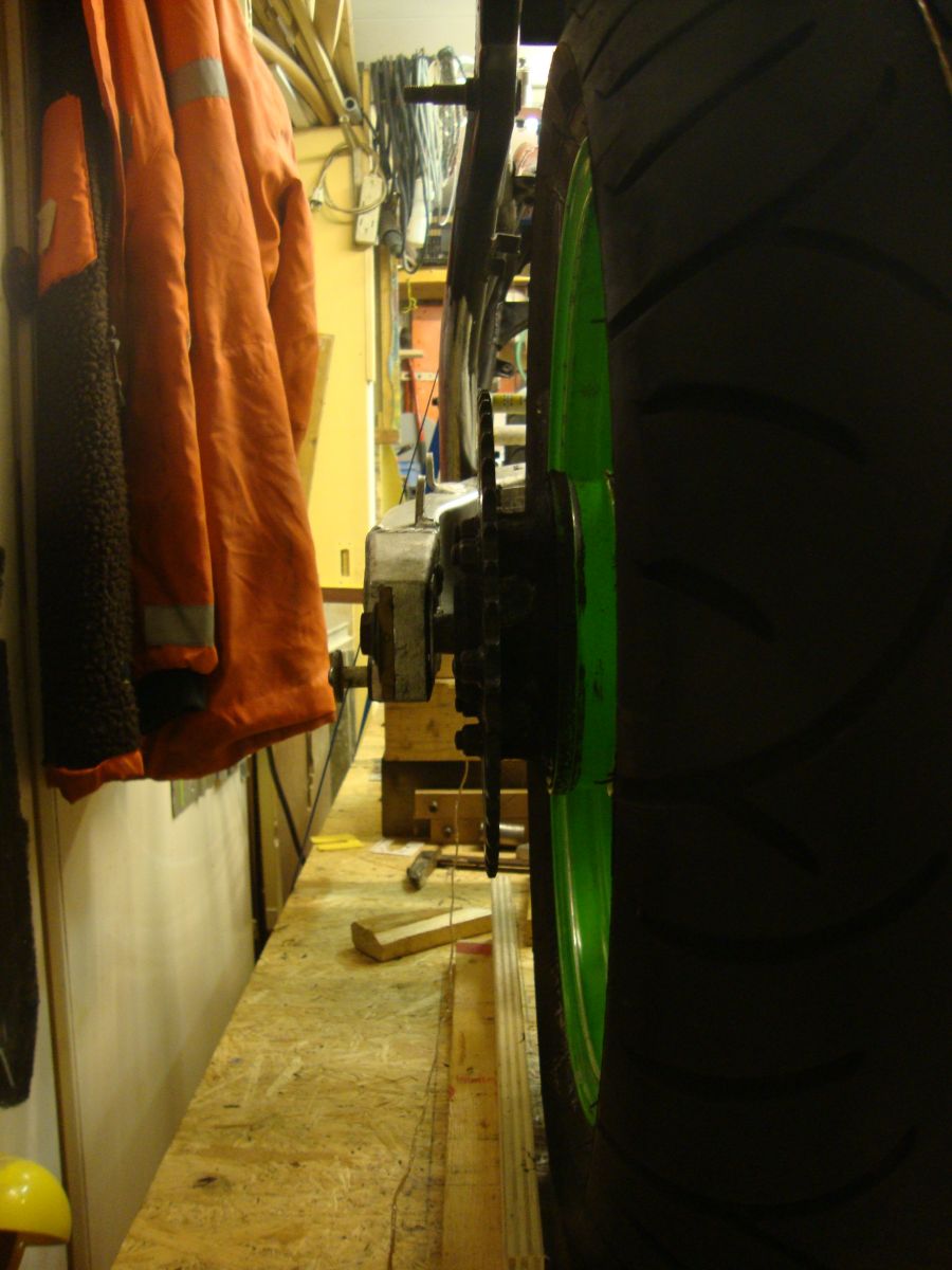 I was looking at how much I could take off the sprocket carrier and there is 15mm twixt the inside of the sprocket to the plane of the tyre.The sprocket is 10mm wide and the chain itself is 26mm wide which means from the inside of the chain to the plane of the tyre would be 7mm. Not much to play with really. Ill think on it though. Lots of thinking before I start hacking bits off.