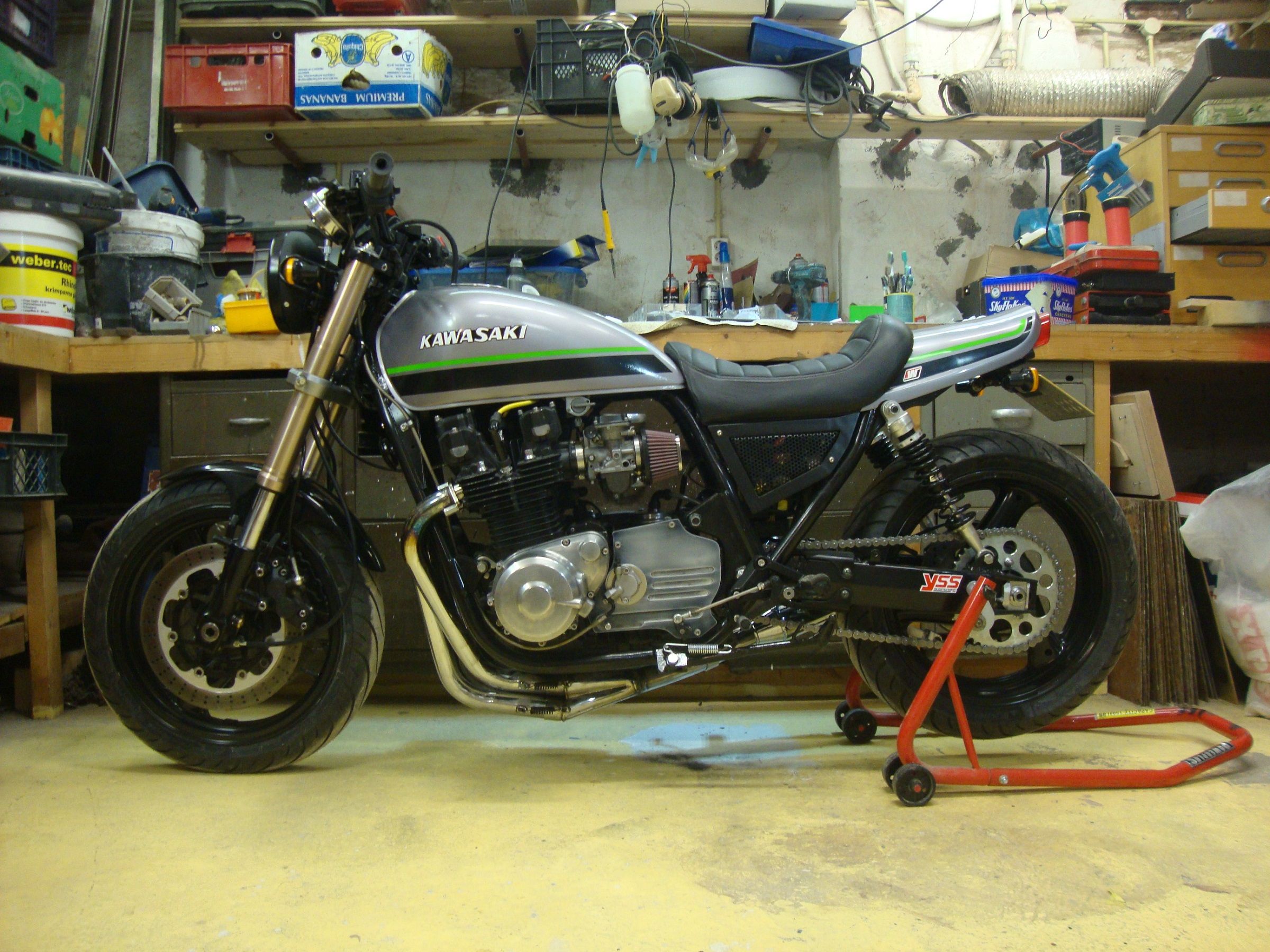1978 KZ650 C2, 130K kms, Delkevic ex, EI, CVK32, PMC easy clutch, ATK fork brace, steering damper, braced swingarm, ZRX shocks, 18" Z1R front wheel.