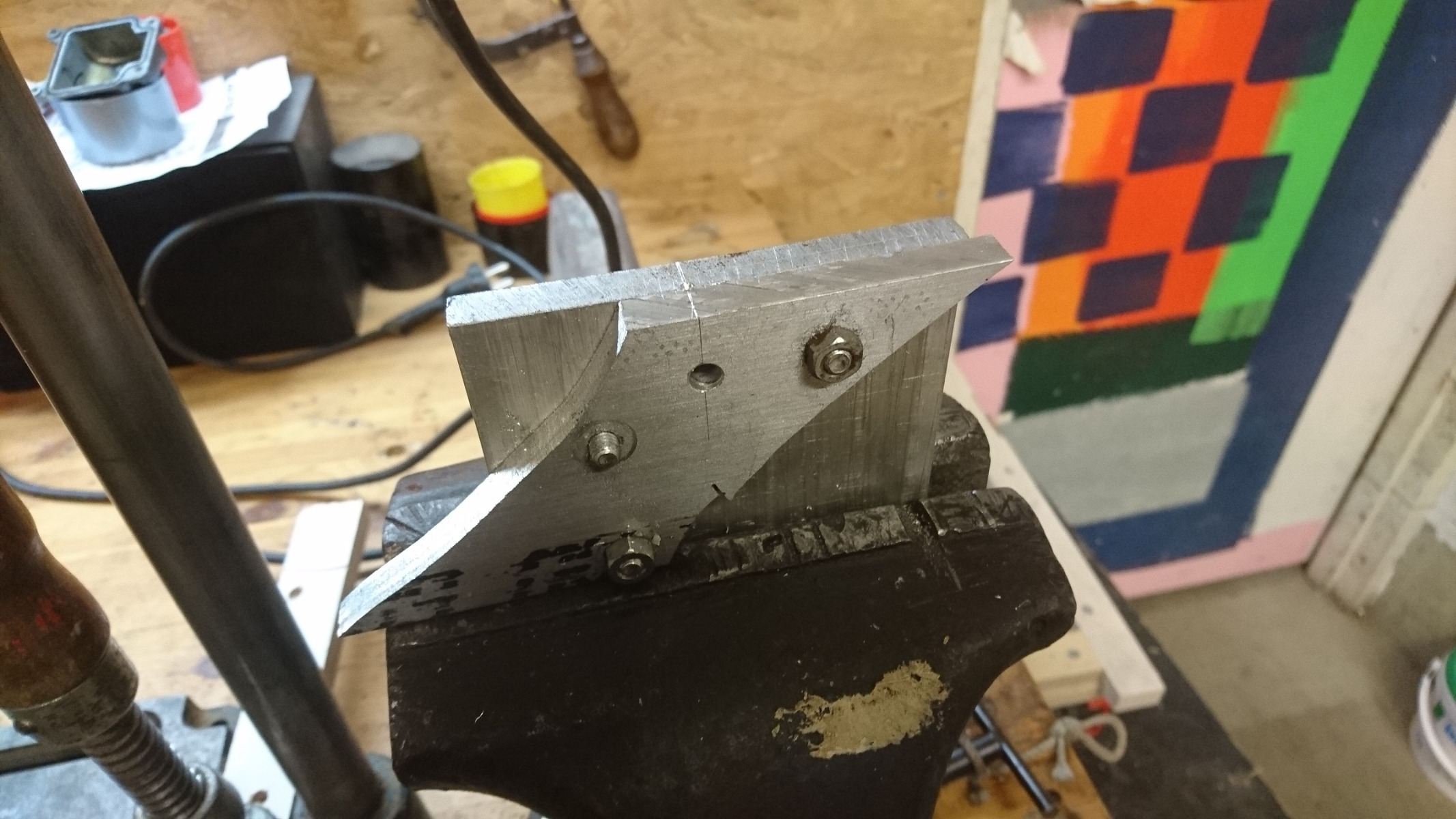 So I measured up the original nipple,length/diameter ( I think 10mmx 6mm) I took 2 sraps of alu plate and drilled a 6mm hole all the way through the first and about 4mm into the 2nd. Bolted together,I was able to drill a 2mm hole perpendicular for the cable to rest in. Things were a bit tight so I drilled it out again to 2,5mm (which turned out to be a bit too big)