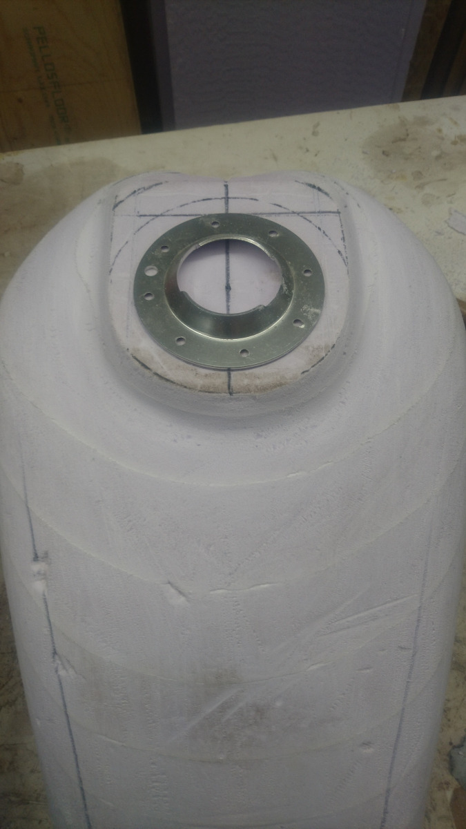 Ended up with some sharp edges on the front of the tank. From what I understand,carbon fiber doesn't like sharp edges,so I glued in some foam to thicken it out. The front and rear ends of the tank come together and end with the seam/flange.I've discounted the flange on the foam block but I still have to try and thicken it up around these areas. I need to end with a round or a block shape. Something that the carbon can wrap around comfortably ( and also something that will not be too tight or difficult to break the foam out of)