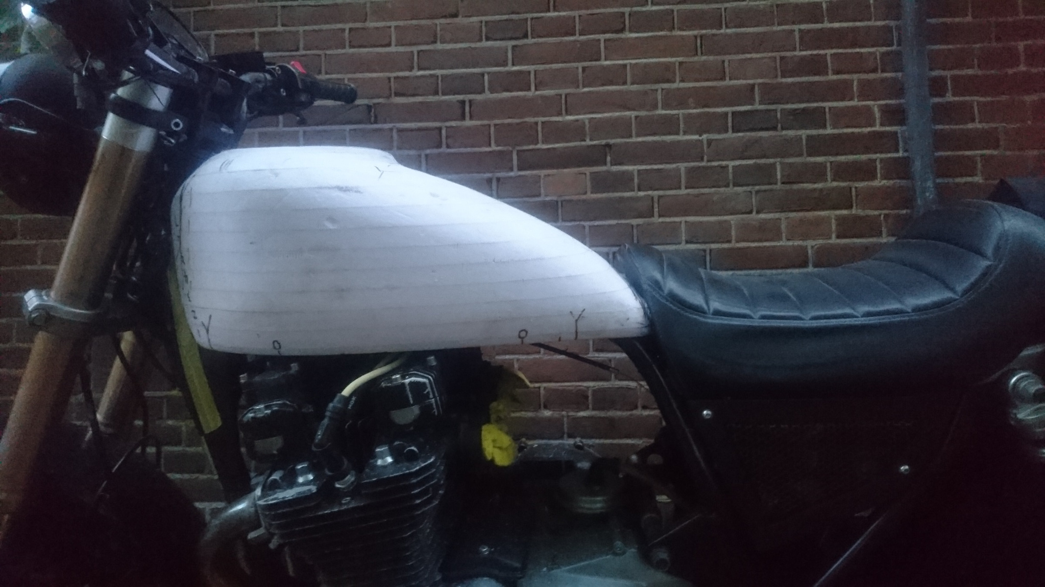The next stage will be to offer it up to the frame and see how it sits. Apart from having it sit down to the right level on the frame, I also have to think about the turn radius of the handlebars, making sure they don't hit the front of the tank on full lock. There's also the seat to think about.I don't want to have to mess around with that,so I need a reasonably good meeting point at the back of the tank.(Again without the sharpe edge of the flange).