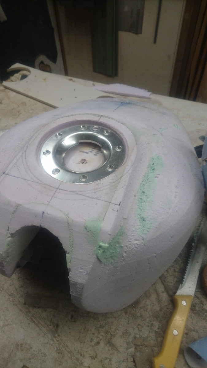 For now, I'm concentrating on the 'foam block' tank. Once that's shaped,looking good and fitting right, I'm going to have a break,as I'm still figuring out the actual carbon fiber/resin situation. I might have a go making another tank 'blank' with the fiberglass molds and builders foam. See which one comes out best.