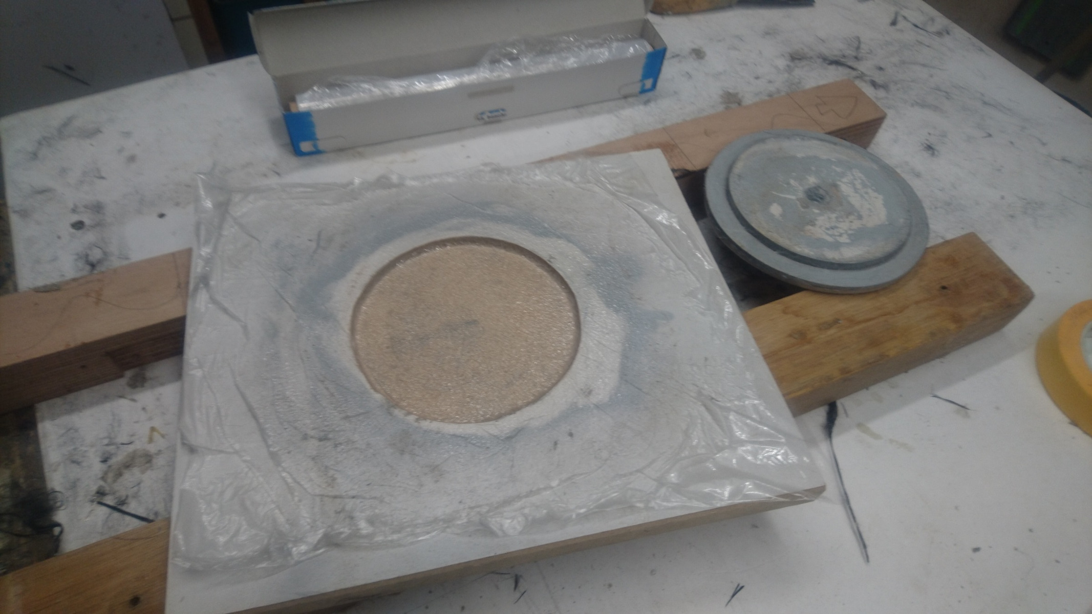 In the end I decided to build a press from MDF. I already had made a plug the diameter of the fuel cap + a couple of mm. So, I routed a hole the same diameter + a couple more mm on another piece of MDF. 5mm deep. Glued cling film on it ( I ran out of release film) and waxed everything up.