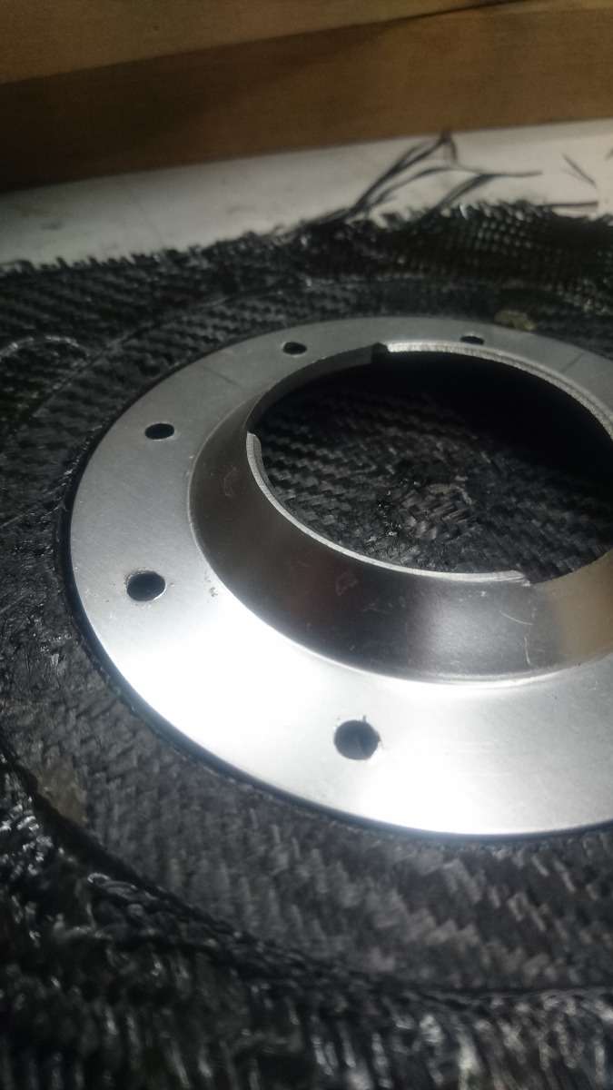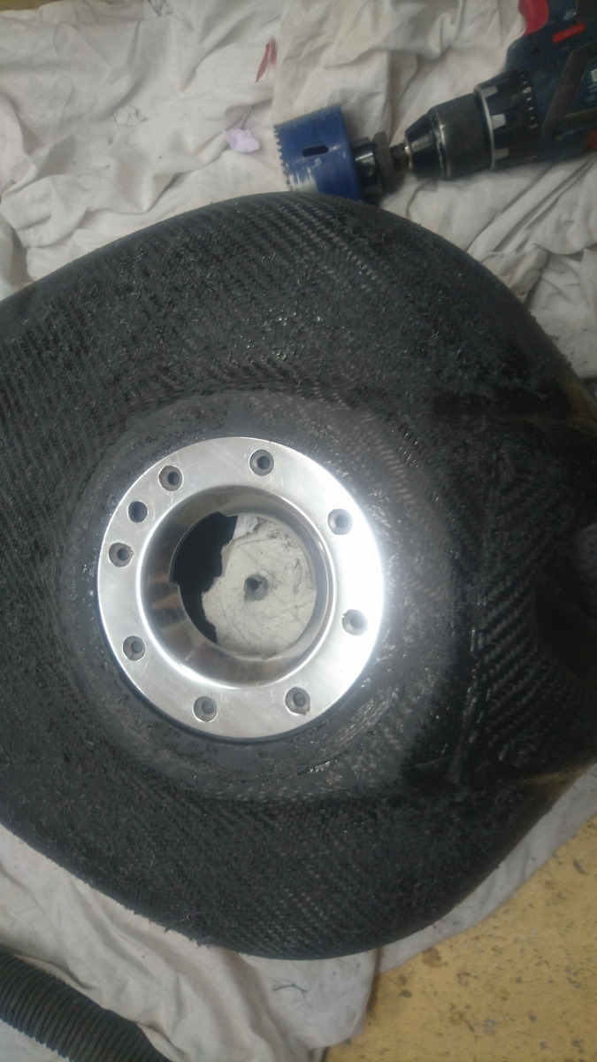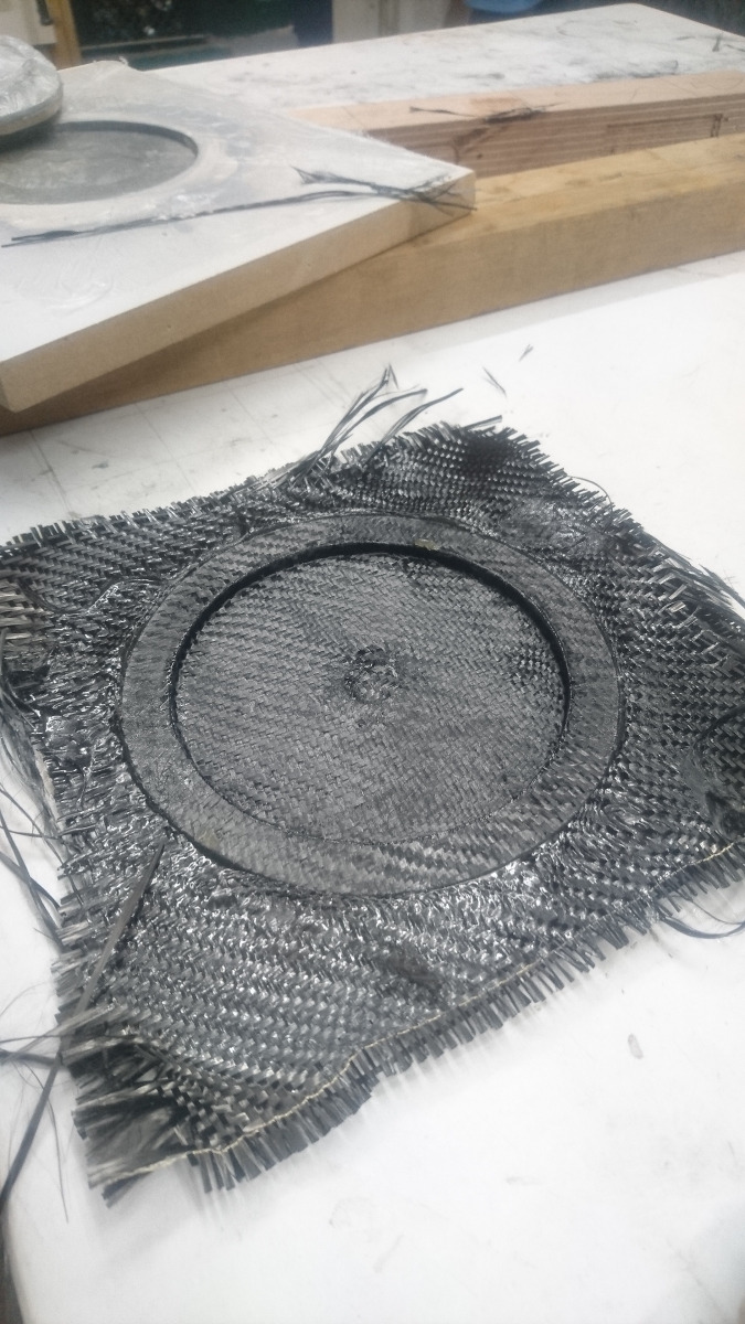 Fuel cap recess yesterday and today. This took a lot of cogitating but I think I've got it. The recess is so small (5mm) I wasn't sure the CF would fold over in a nice clean sharp way. Also, layering the top or the bottom of the recess isn't such a problem but the side is. A strip of 5mm CF!! Not easy but it needs to be done. If not, there's a danger of the whole thing splitting or cracking. Also,calculating the diameter of it. Which is the diameter of the fuel cap mount (120mm) Plus 3 or 4 layers of CF and resin (??? No idea how to accurately figure that out).