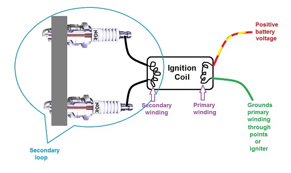 When the coil becomes ungrounded (by the points opening, or the Dyna-S magnet passing by the pickup, or through the igniter), the coil "fires" through the secondary loop (including both spark plugs).