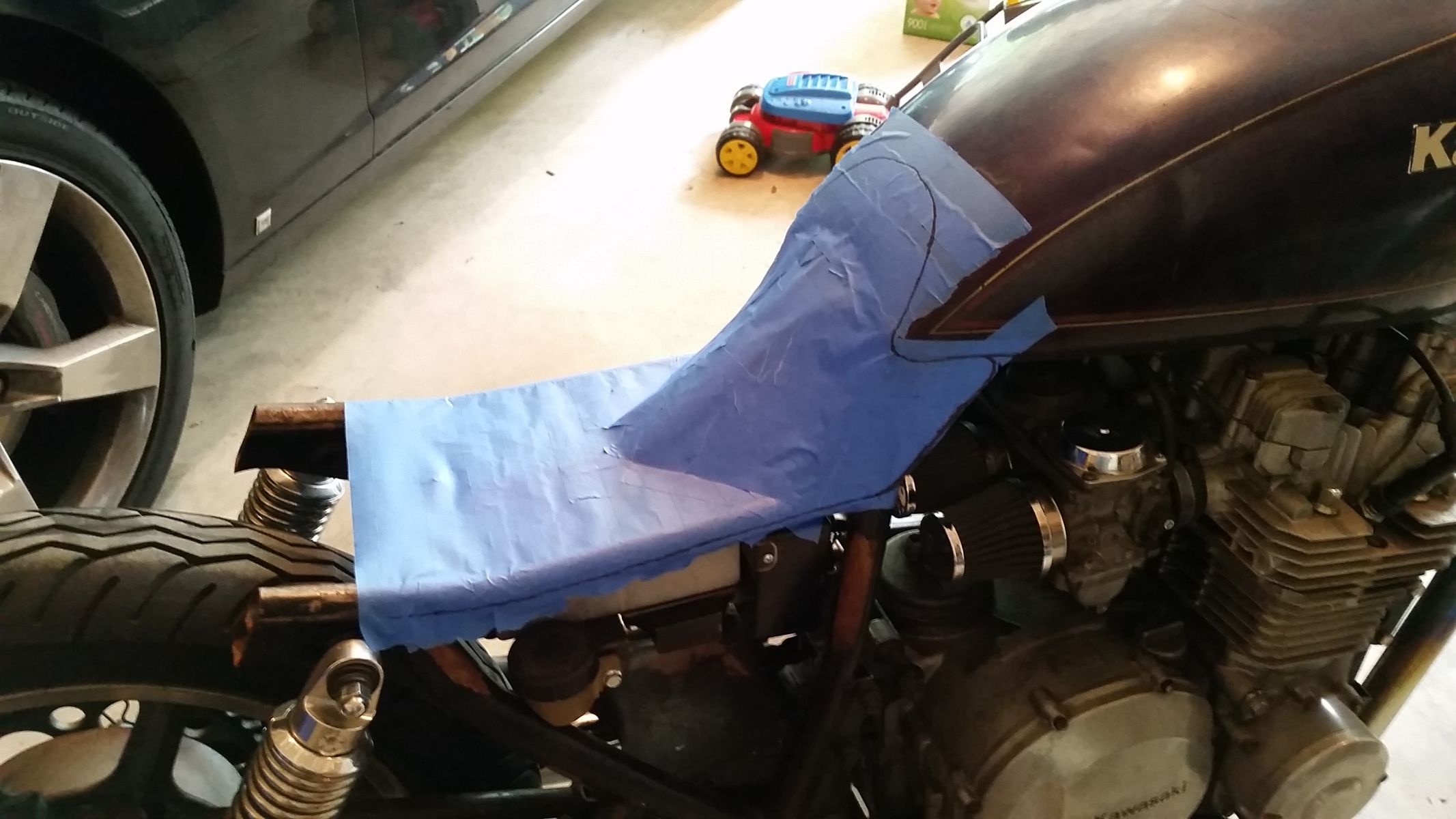 Followed the line on the tank from the old seat ... but may refine that with more of a point rather than a curve. Rear isn't figured out yet but I taped it up to see how it looks. Will probably mount the stock fender rotated into the bike to have a small 6" fender behind the seat.