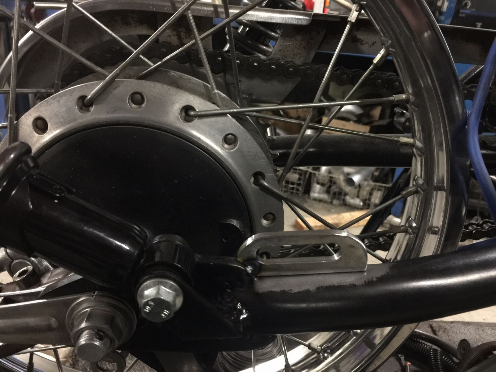 Originally I was gonna take a .120 wall tube and cut it in half to make a C shape, then have that rest on top of the swingarm. I'm sure it wouldn't have moved once the axle nut was tighten down. So I think I went a lil overboard? Now just gotta figure out how to get the lever connected once I get my new rearsets on/fabbed.