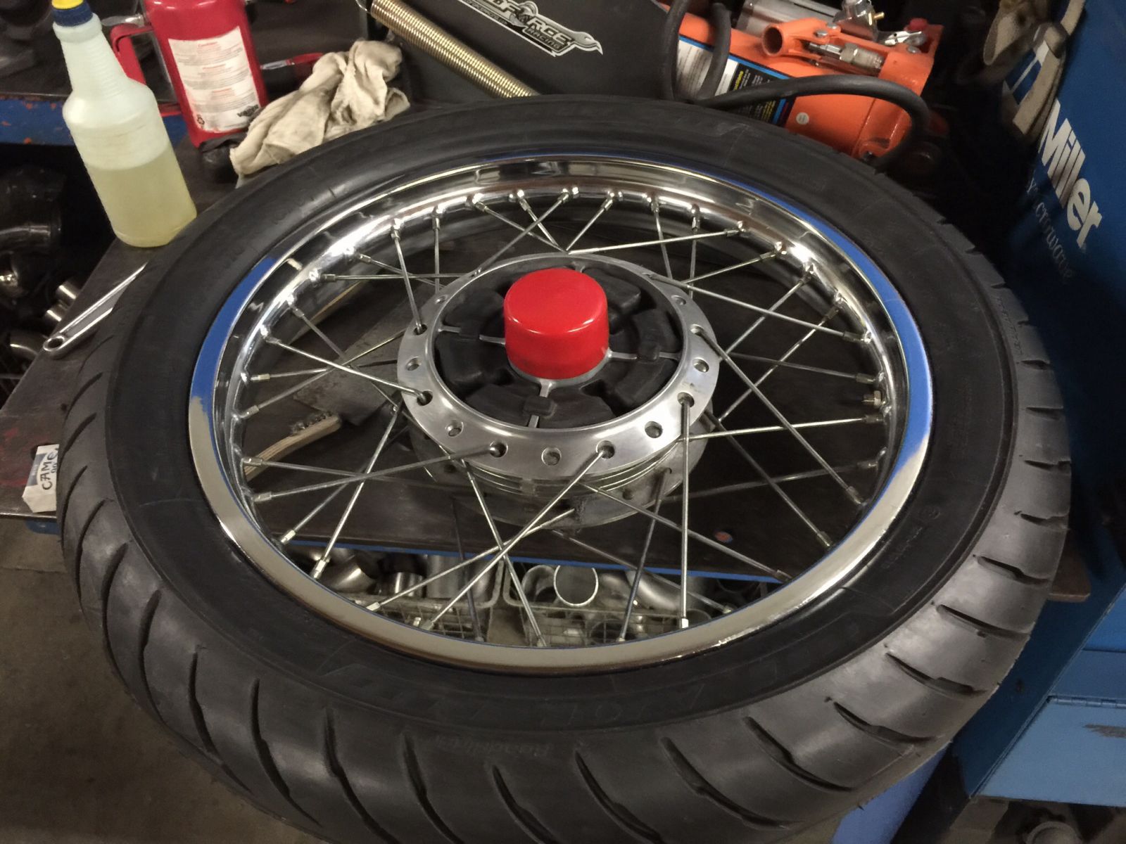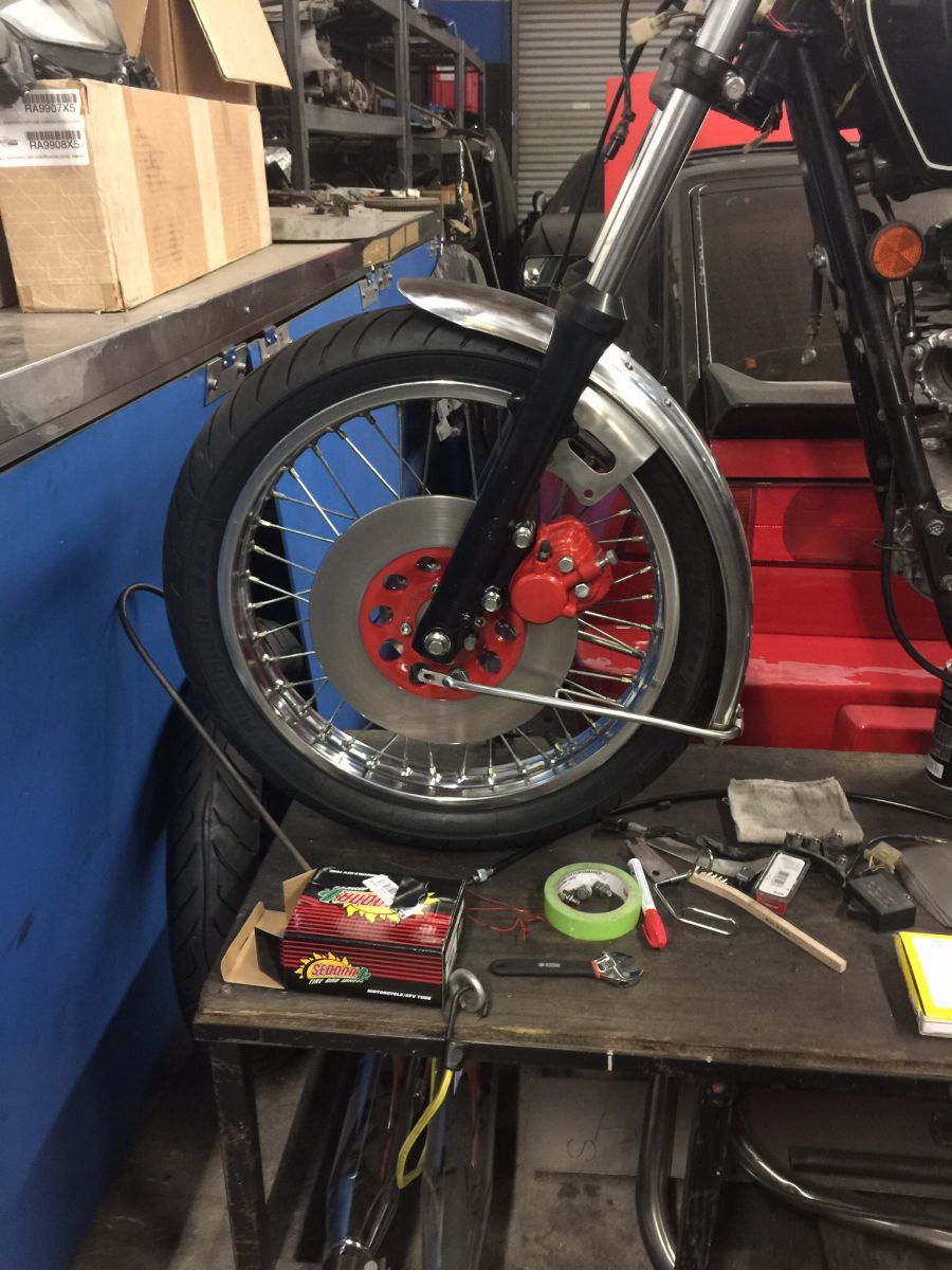 All that's left is a brake line(on it's way, Thanks Mike), fiddle with tire a bit to get it to seat squarely around the rim. Mechanically, the front is 90% done more or less. Mounting 90/90 Avons with a tube is a little tough.