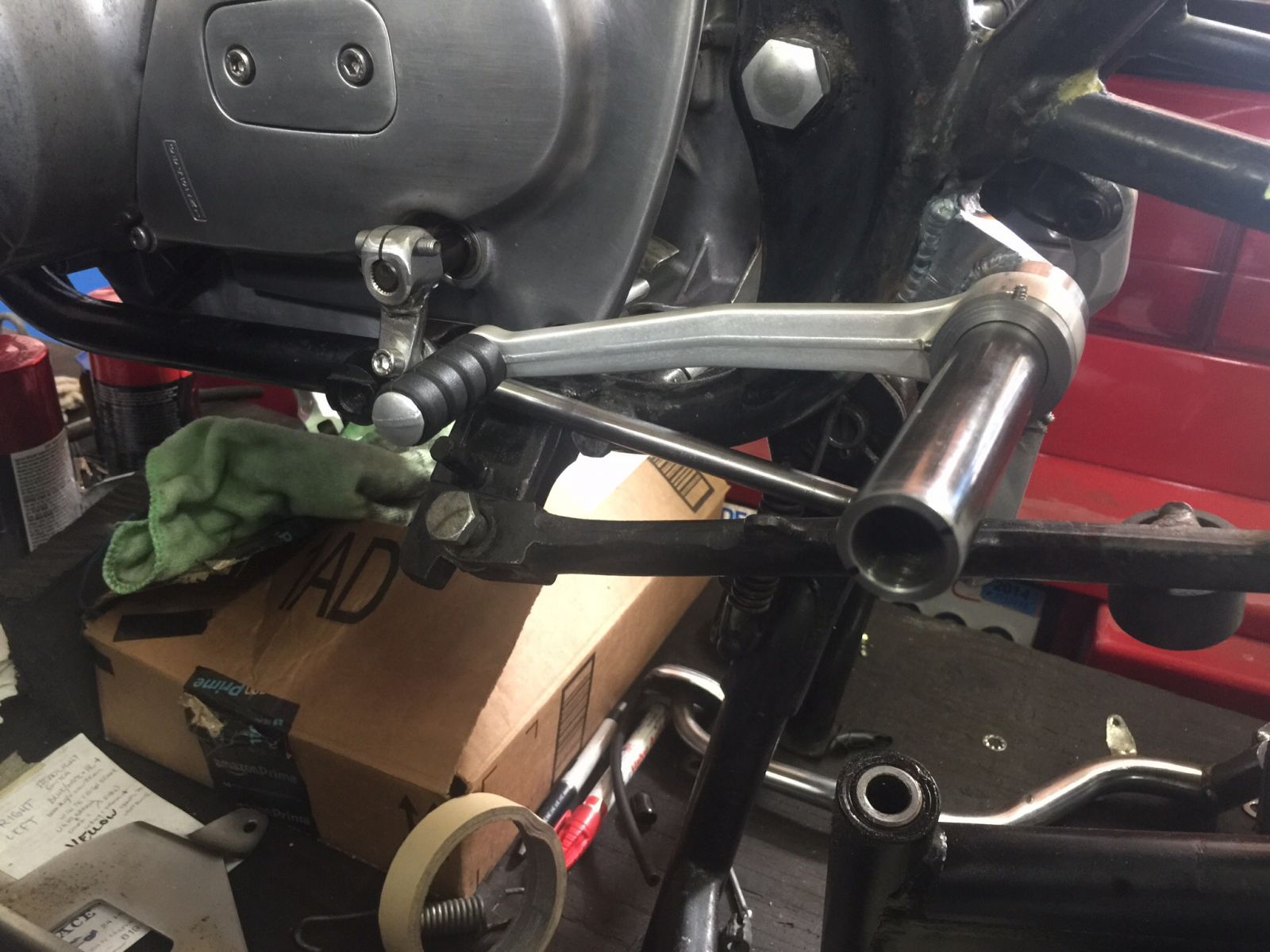 Another shot. 6mm hiems. Even have a left hand thread one on there. Shift lever came off my buddies BMW RR. Had to cut the ear where the hiem goes and re-weld to the bottom.