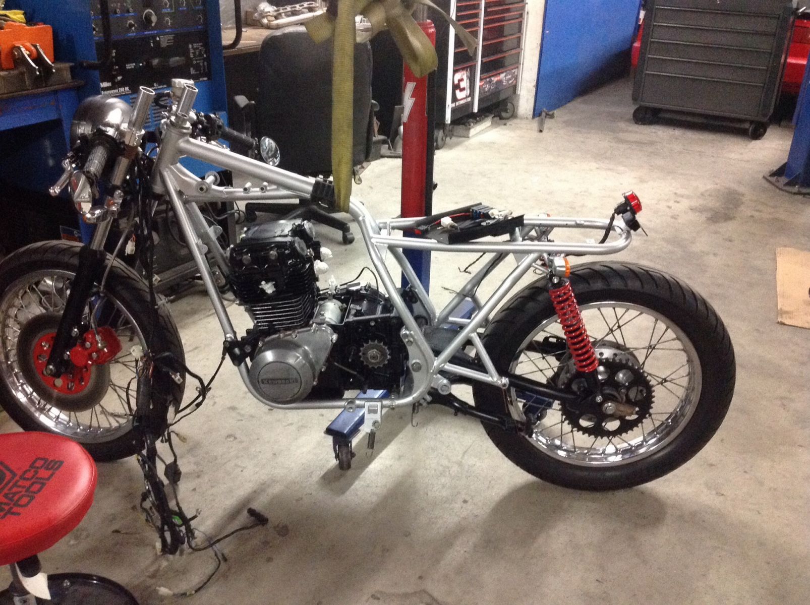 Don't mind the tail light..I broke the plastic lens on the old one and needed a brake light like now..Also had to redo the seat and tail. Before they had an overhang that would cover the frame. Didn't wanna cover that up now do we? The tail is still work in progress. What a journey..lol