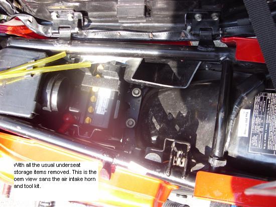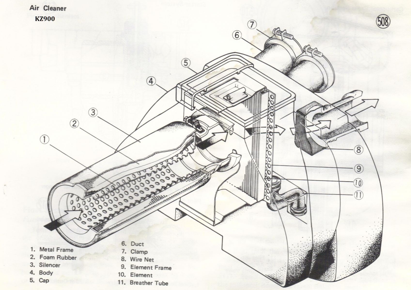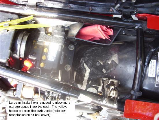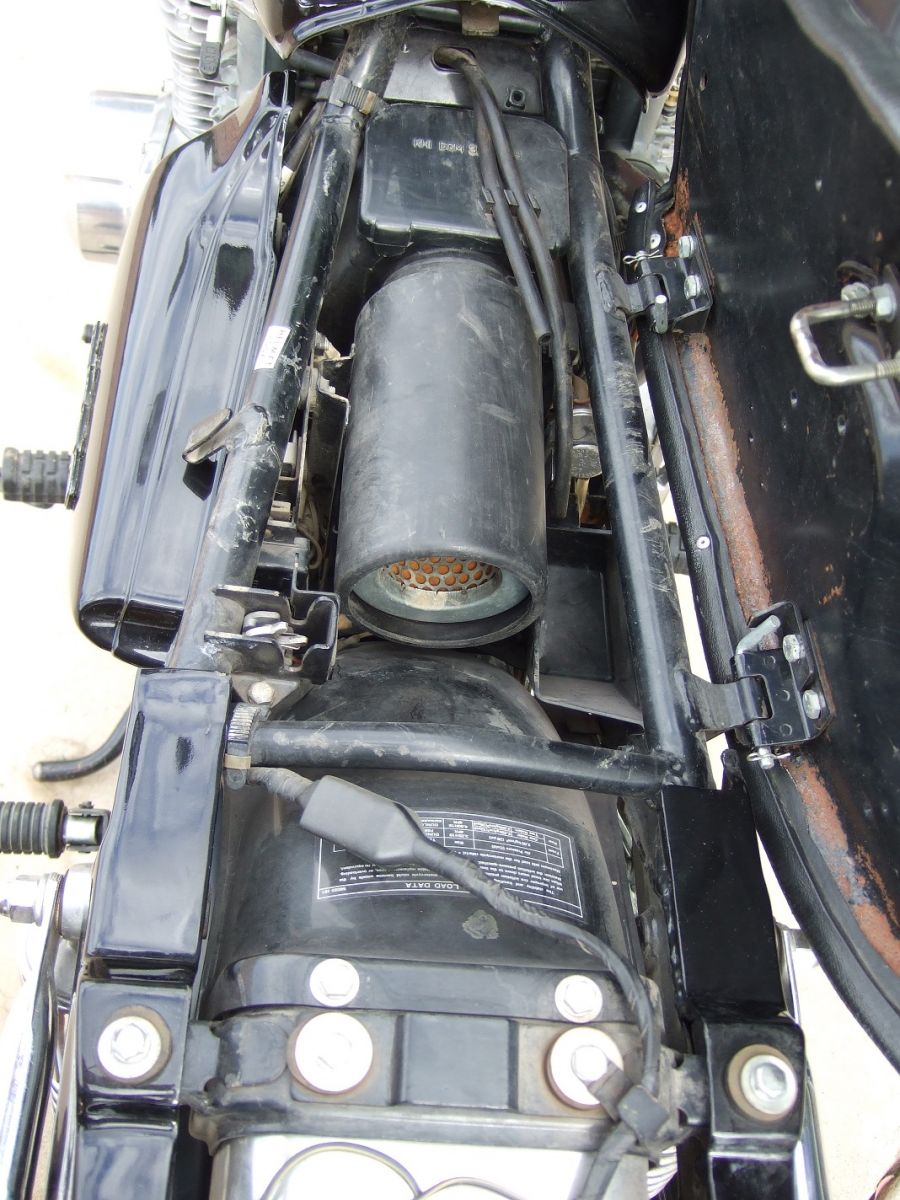 In order to gain more storage space under the seat, I run my KZ900 with the intake silencer tube removed from the air-box.