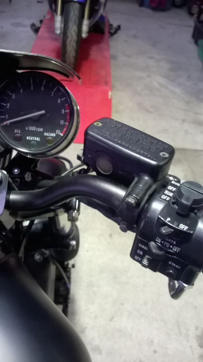 It may seem that I had either died, been abducted by aliens, but no I am still working on the KZ. Honest, I am...... Anyways, ordered up new braided front brake lines and fittings and fitted the CBR1100XX brake master cylinder. Now I have front brakes! Also fitted the the radio box tray and it also has a centre stand now too! If anyone happens to have or know of a radio box for sale please let me know.
