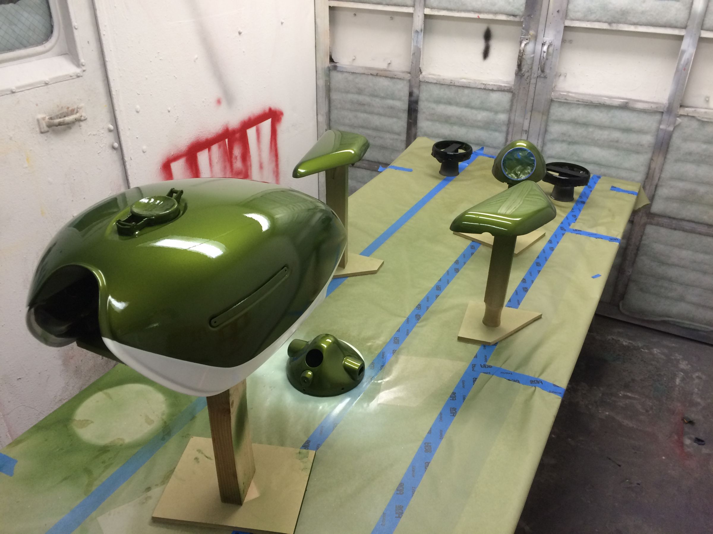 everything is ready to rock and test is sprayed. I was hoping it would be a little more green but i do like the color. I might go buy some of the green toners and add a bit. I also pressure tested the gas tank in my sink to check for leaks before committing to paint. Hopefully this Friday it will go down