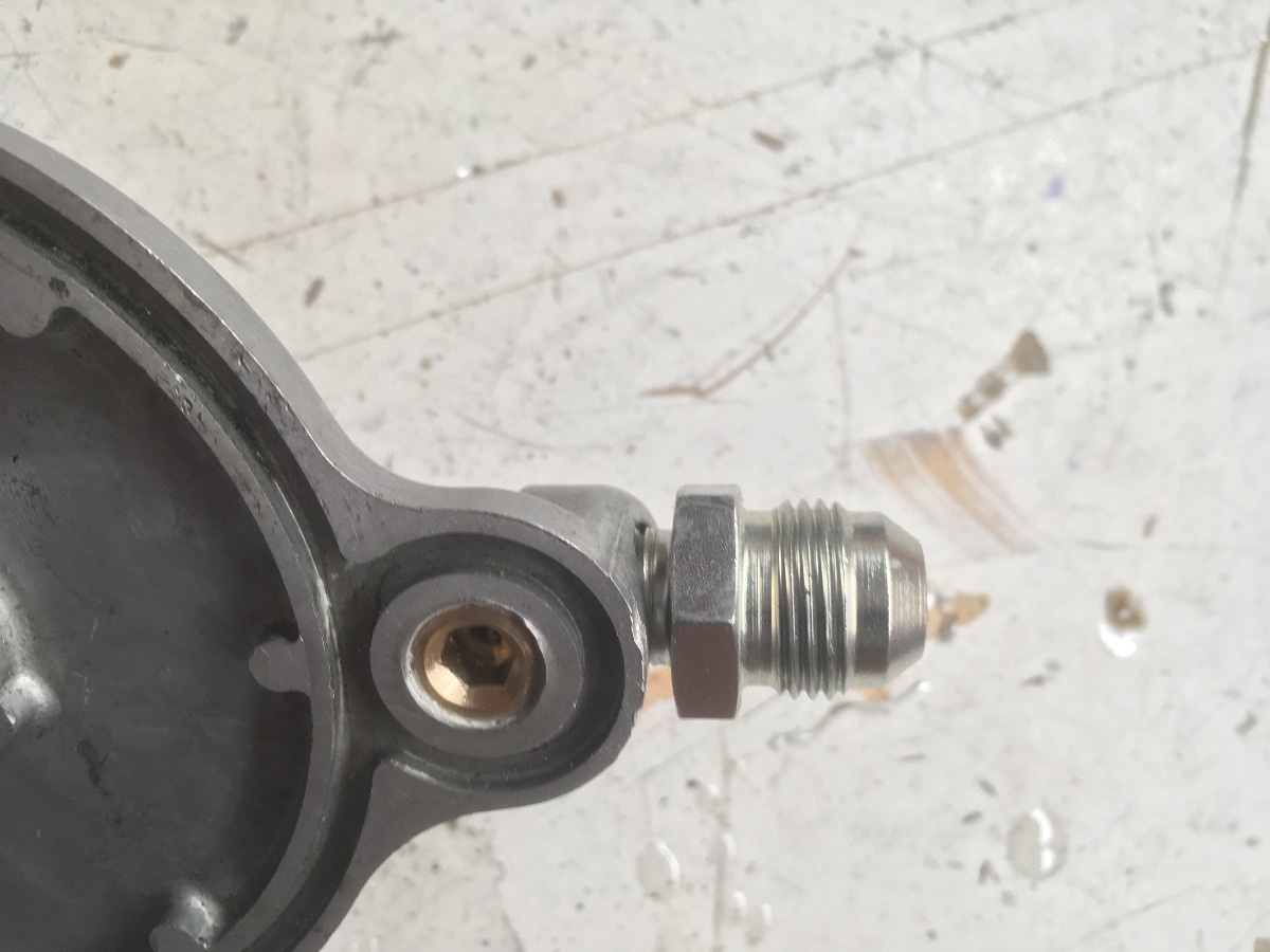 I actually cracked the edge of that cover trying to hold it in a vise so i had to make some wooden jaws to hold it. The existing holes are already perfectly sized for a 1/4"NPT tap. I used 1/4npt -8 AN fittings. I got steel fittings so I could drill out the 1/4" NPT side to match the 8AN diameter without loosing strength.