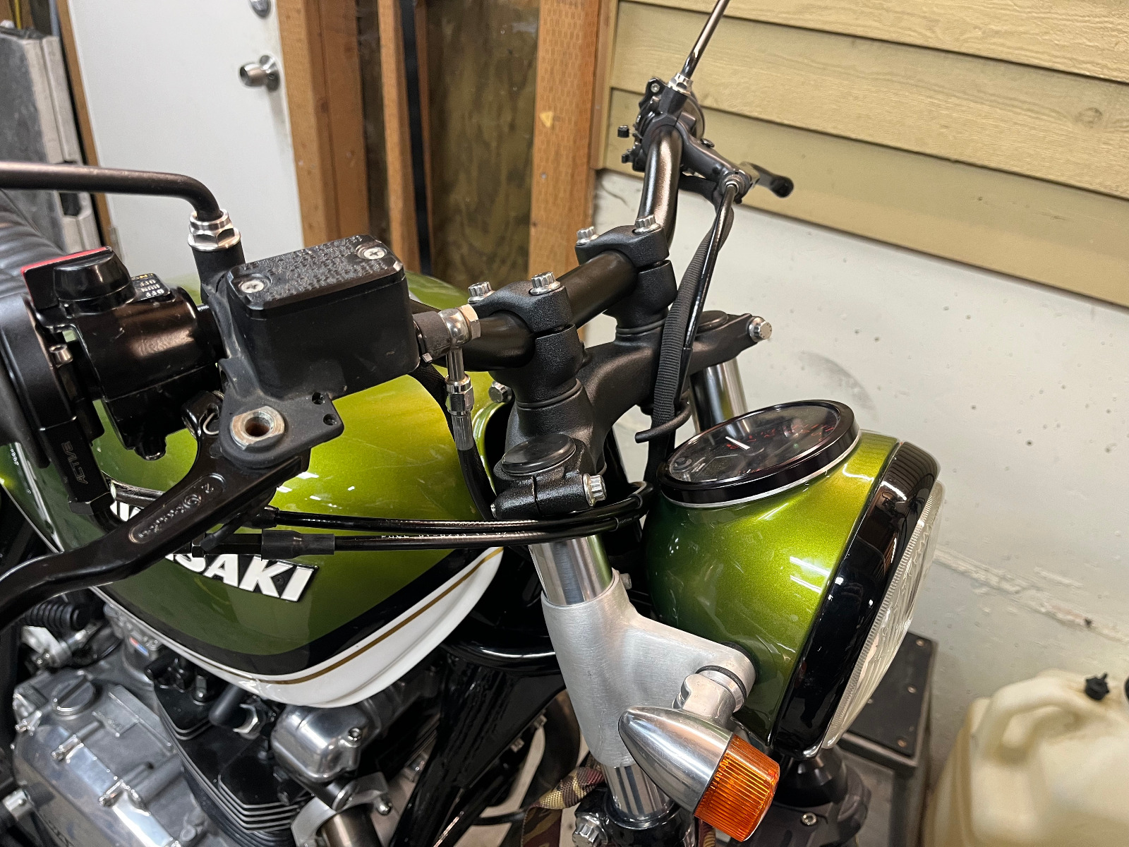 New bars came in and the owner is happy with them. These gold ones were $50 cheaper than black and I was going to paint them anyway to cover up the Rizoma logo. I went ahead and shortened the throttle and clutch cables, machined new ends and ferrules in stainless. Soldered with stainless specific solder and flux and its good to go.