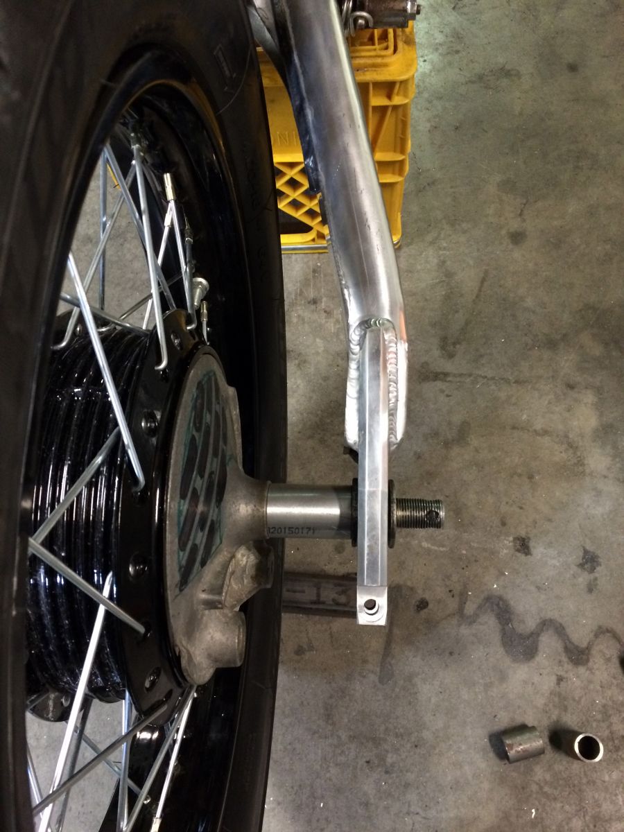 My buddy had some time to turn up the wheel spacers. The swingarm is a perfect fit in the the 750 twin frame, nothing needed there