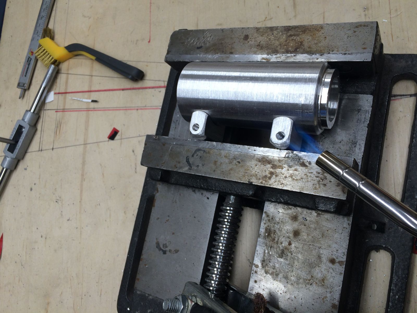 Started working on the headlight ears by machining up these bits and welding em up. I made a sleeve out of aluminum to keep the tubes from going out of round while welding. now it's clear should have used steel for the sleeve because its stuck in the second. I'm going to slit them tomorrow on the mill and will cut through the sleeve too, hopefully that will help me get the sleeve out.
