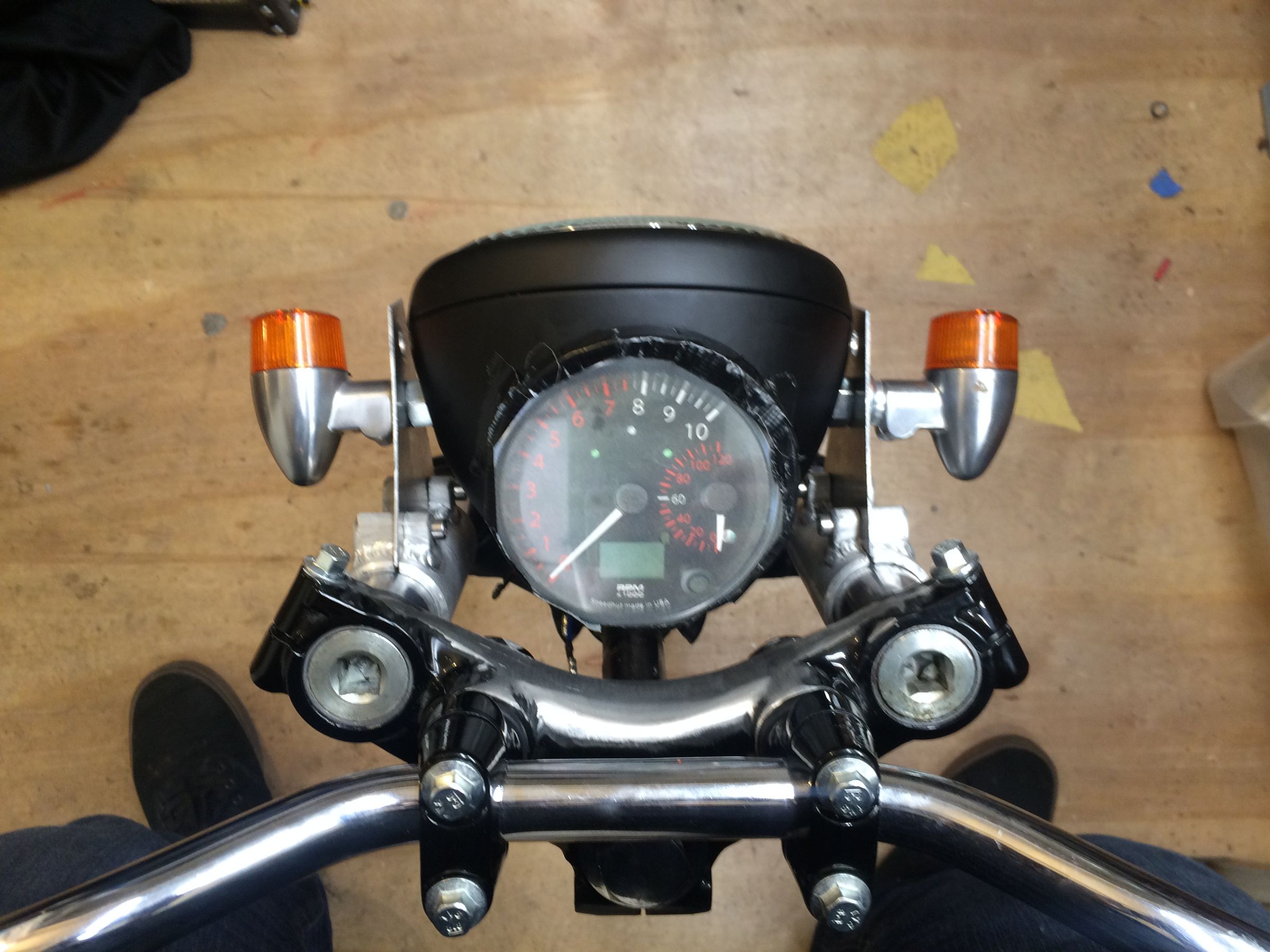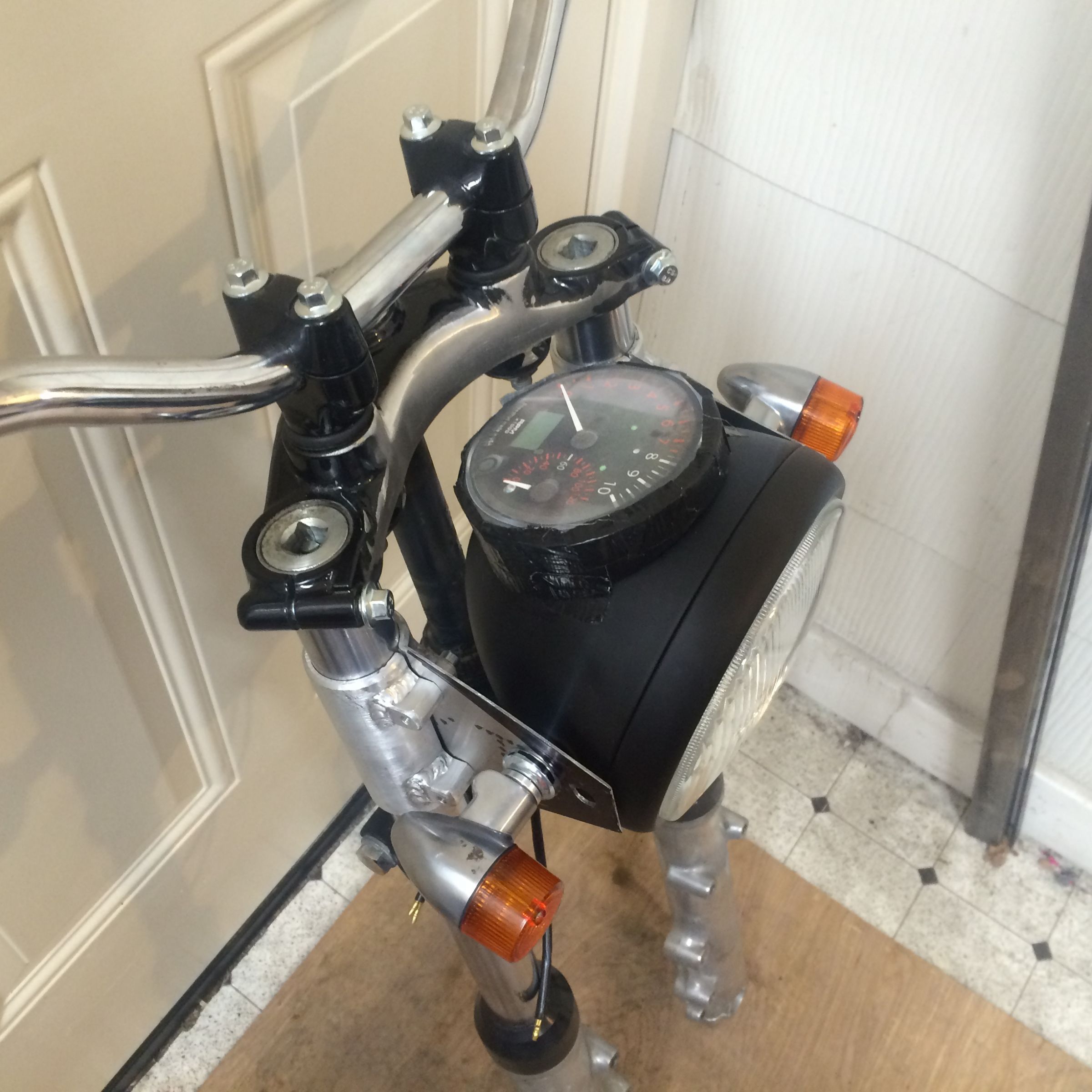 The headlight ears above are just mocked up right now. Once I decide on the final position of the headlight I will make some hollow forms to weld to the clamps and rotate the pinch points into the inside so they are less visible. I personally don't like the look of that Vincent gauge it looks like an afterthought.