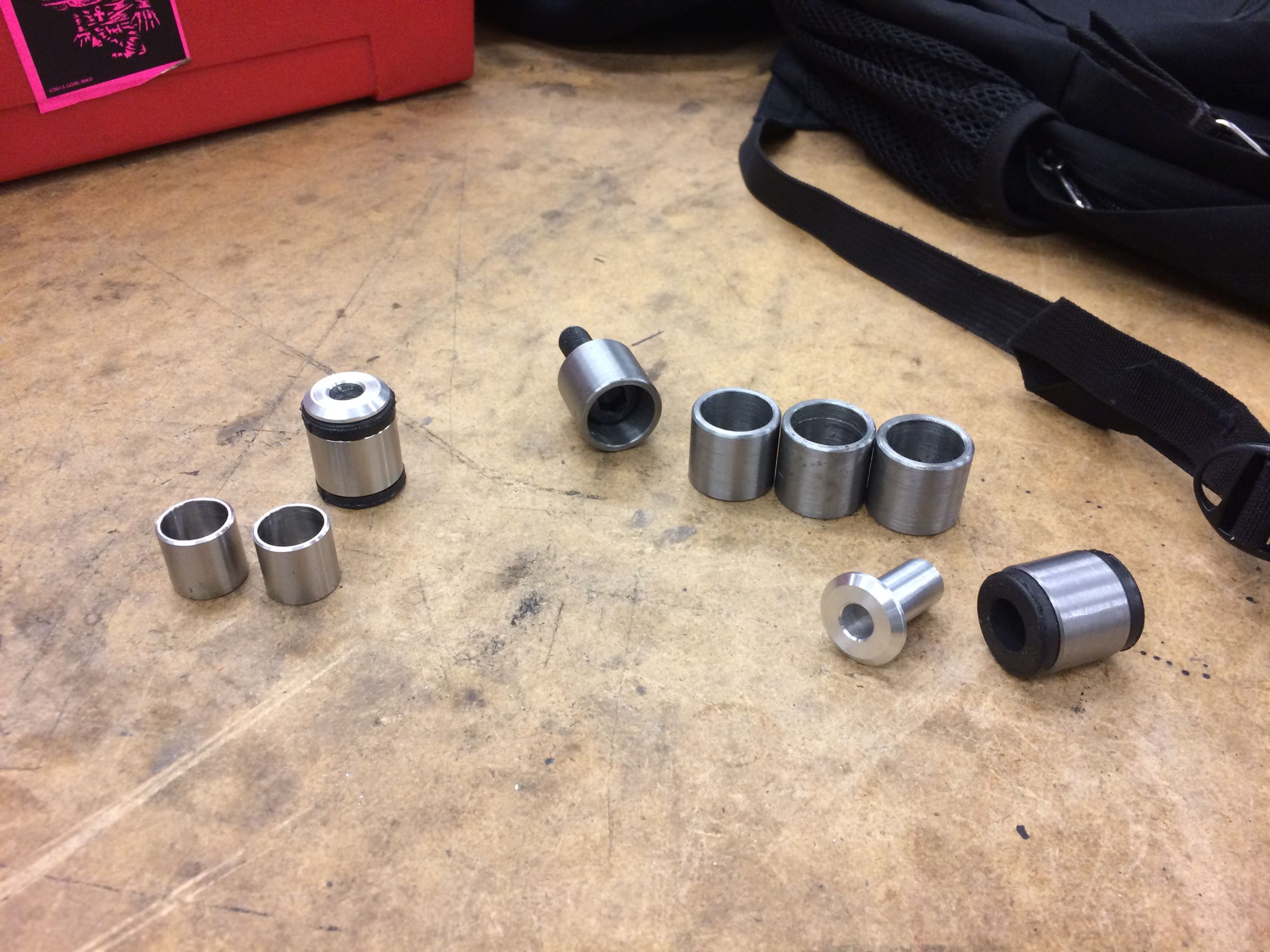 Turned up a bunch of bungs. Stainless on the left for the 1000 exhaust hanger, and mild on the right for the passenger foot peg mounts and the exhaust hanger for the 750. Chipping away...