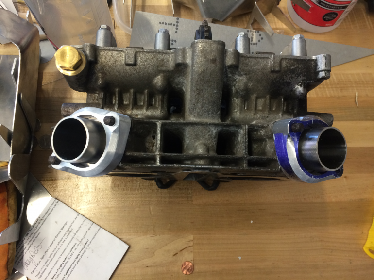 Exhaust flanges are nearly done. Had some fun on the rotary vise, also thinned them a bit and sank the retaining ring a bit deeper. No chamfer mills so I chamfered them with files. They still need a bit of polishing.