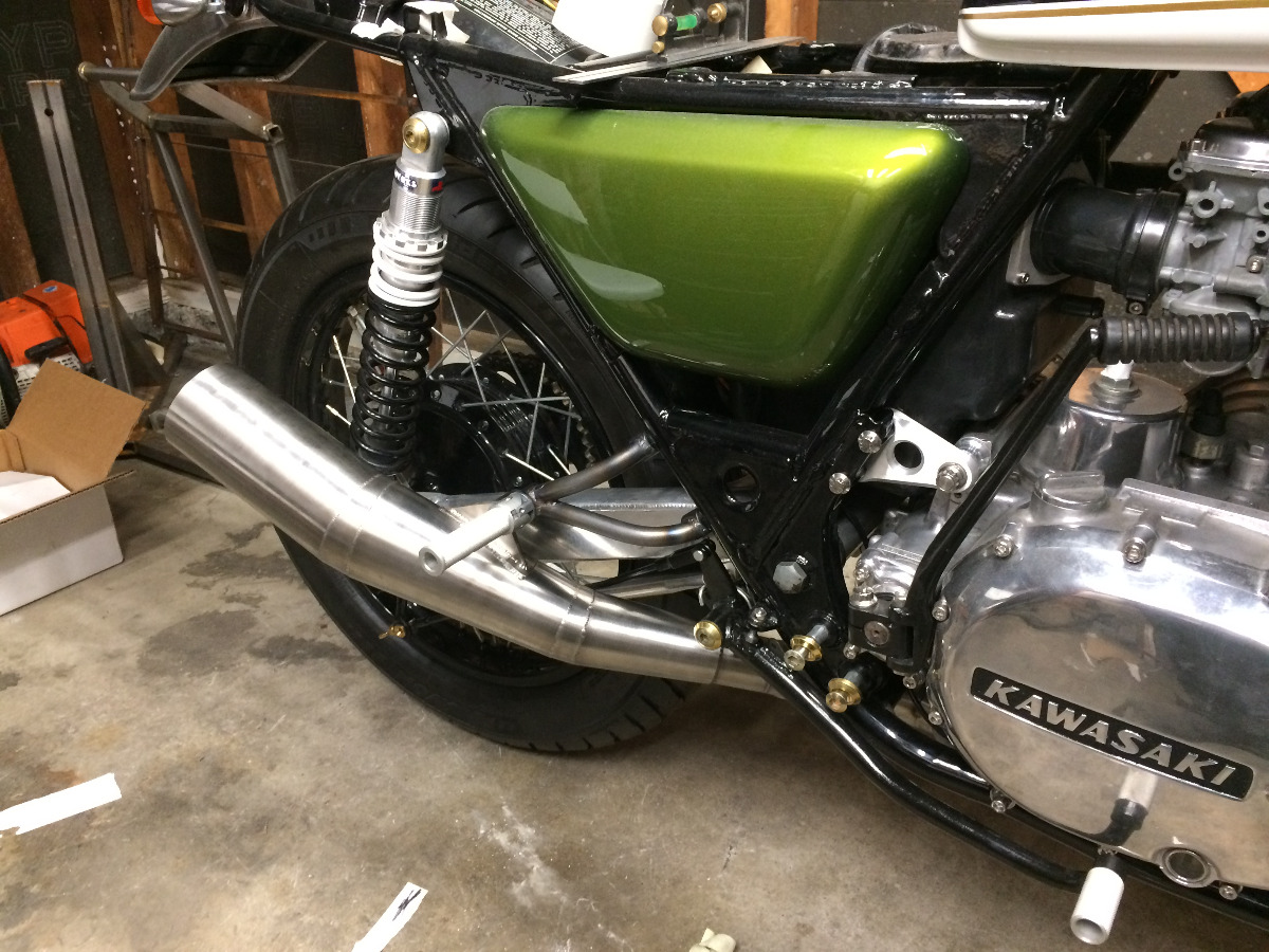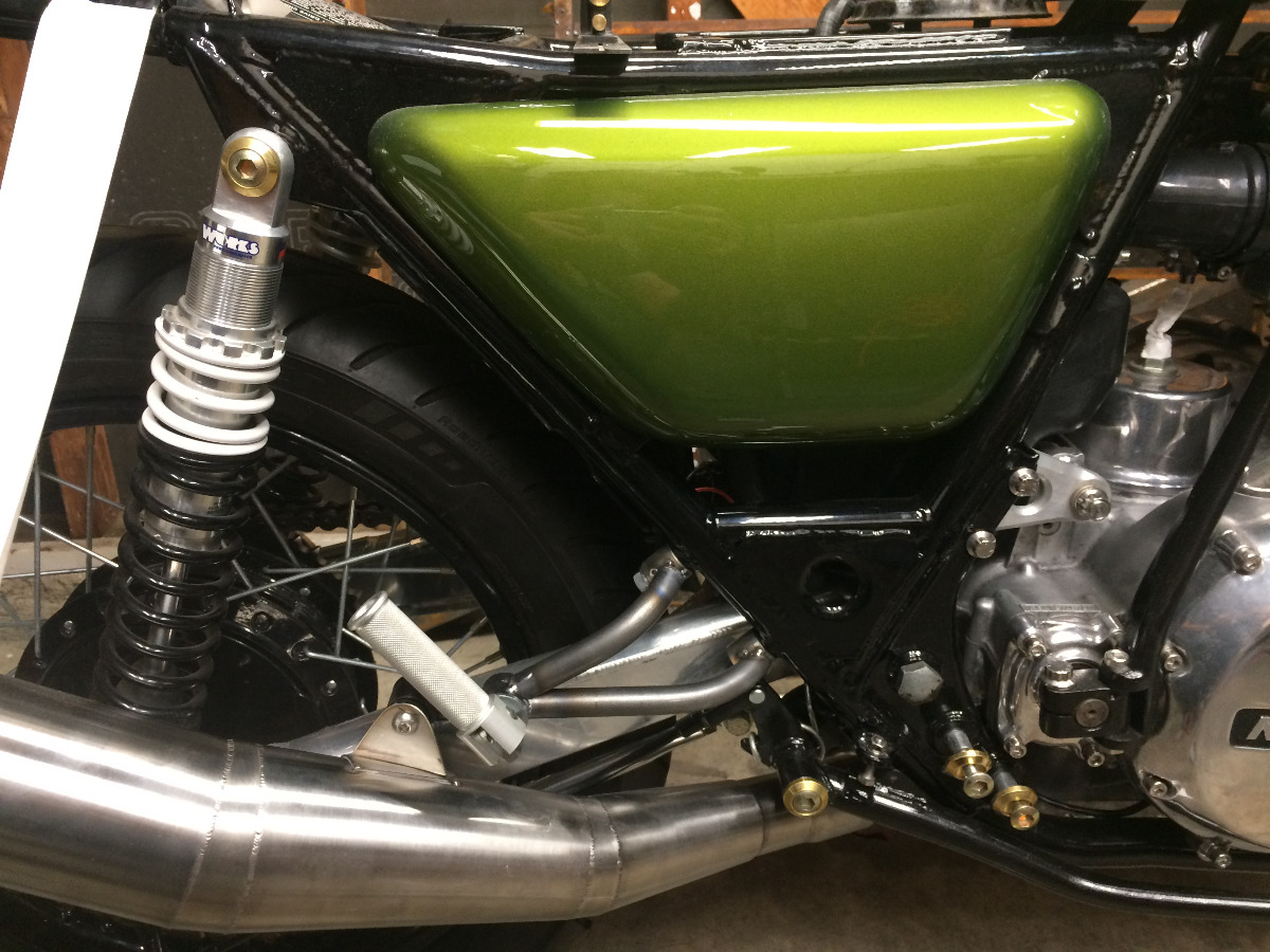 Made progress on the hanger and exhaust mount. I'm using some Tarrozi folding pegs that were intended for a different project. They're a tad long for passenger pegs so I will probably cut them down eventually. The mounting bungs i originally turned were too big to look good so I remade made them. I'm not sure I like the placement of the "load spreader" (for lack of a better term.) The part on the muffler can that actually welds to the muffler, not the tab that connects to the rubber mount. It looks a bit odd to me, i might end up cutting a trapezoidal one to follow the lines better. I think there has to be a cooler way to weld on the tab but I'm not sure. Also I'm wondering if its thick enough; its only .065" while most I've seen have been .125" I don't want it to crack.