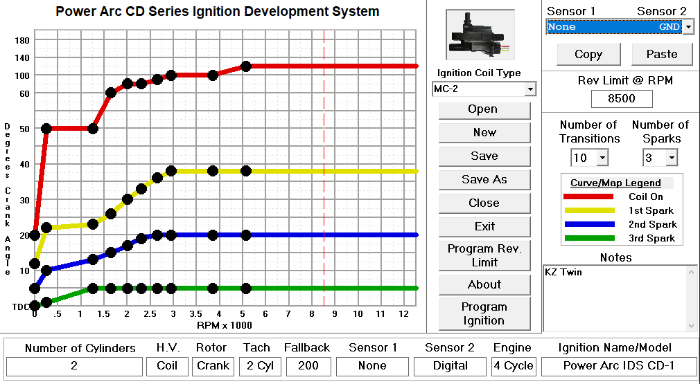 This ignition curve came programmed from C5. they sold it specifically for the KZ twins. I ran this ignition, with this curve, on both the stock engine and my mild hop up, it worked well. With this new engine package I want to be able to modify the timing to get the most out of it without making it go boom.