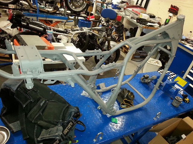 Work continues, the triple tees painted and new steering roller bearings in place the fork goes back on and the wheels goes the same way.