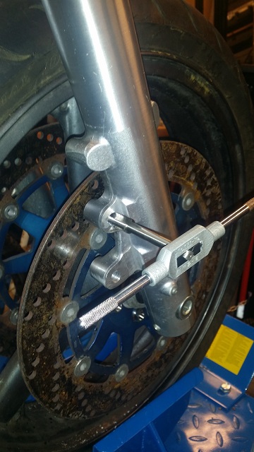 I thought it would be an easy fix to drill out the caliper mounts on the fork legs and Helicoil them in order to fasten my new brackets to the fork legs.
