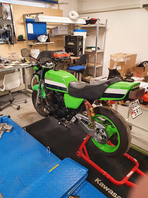 I still have some “pimping” to do, rebuild and repaint the vintage Öhlins, rebuild the front brake calipers, repaint clutch and generator cover, no biggies so its time to place the next victim on the bike lift.