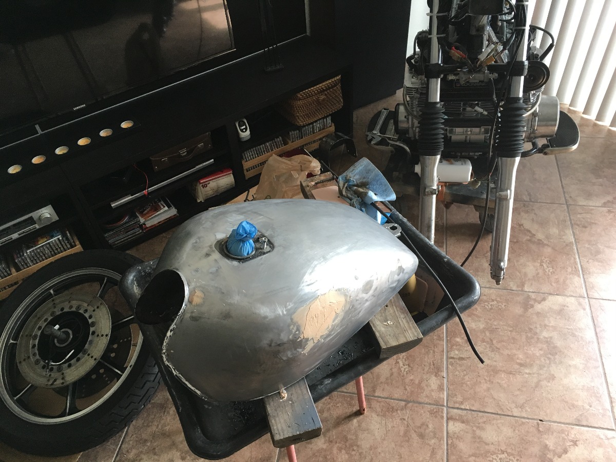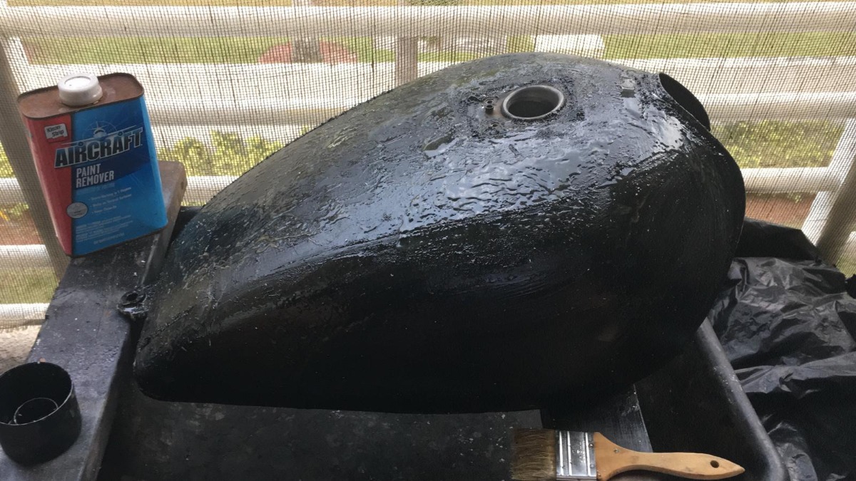 This tank was covered with two coats of super heavy duty paint. It took several coats of paint remover, lots of scraping, and a lot of swearing to take it down to the metal.
