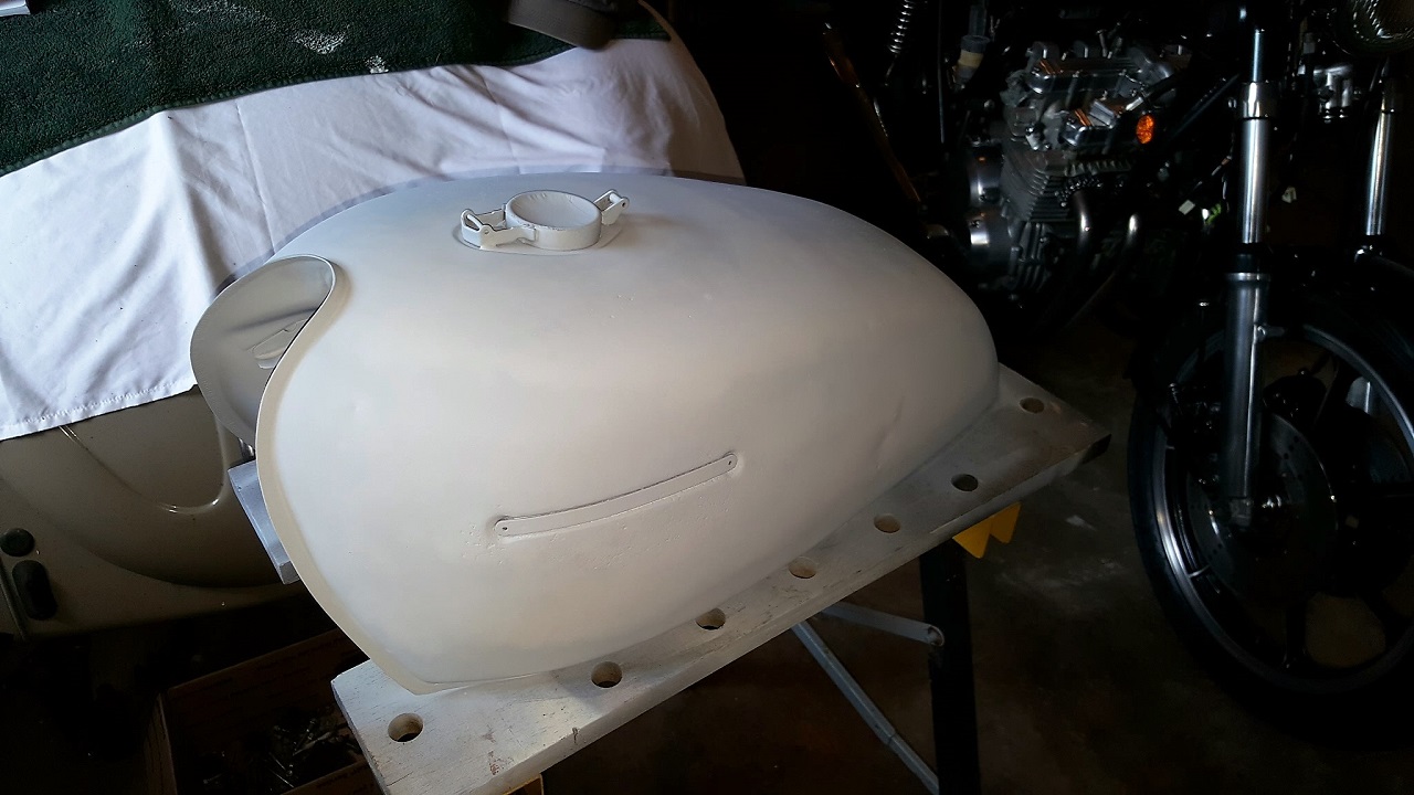 Within an hour, I had sanded, wire-wheeled and primed with etching primer the whole tank: