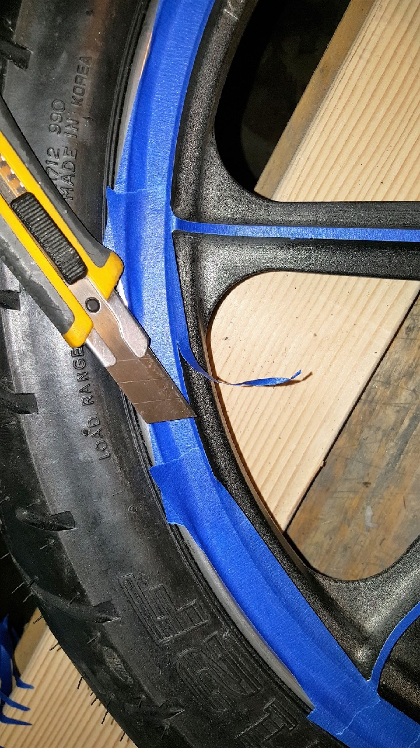 I applied short lengths of masking tape around the wheel's perimeter and then came back with a razor knife to neatly slice-off the excess, following the inner radius of the polished face in the same manner as I did the spokes.