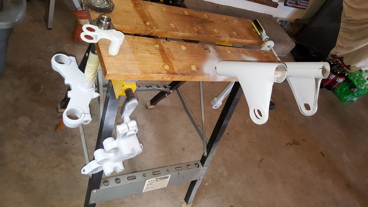 By noon, I had all the random engine mounting brackets, brake torque arm and triple tree pieces etc cleaned and primed:
