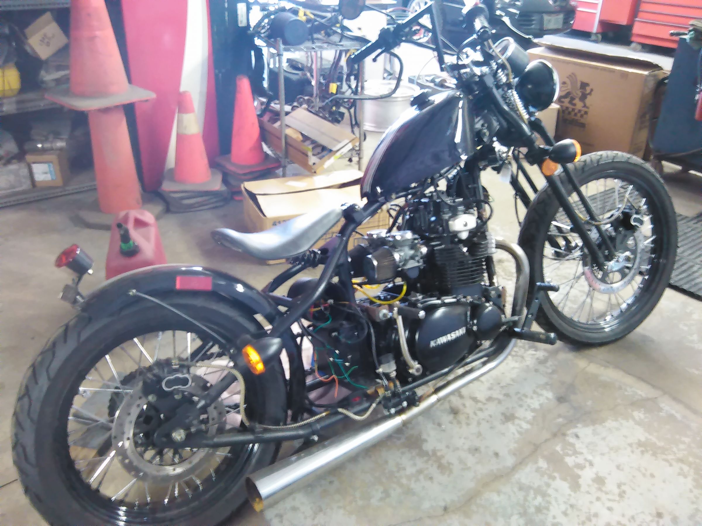 09 May 2016 11:37Yes you read that right I'm working on a Dongfang Kawasaki. The bike belongs to a friend of a friend and he asked me to help the guy by getting the wiring sorted out. What this thing turns out to be is a Chinese made chopper/bobber that originally came with a 250 cc Chinese made POS motor that lasted for all of 327 miles before it but the dust. His son decided to put a KZ400 motor in it as a replacement. I got the wiring sorted out and got it to pop on ether. I then decided to check the fuel in the tank which was stale as he'll. After draining the tank I decided to pull the carbs and check them over. Good thing I did. In addition to having green stale gas in the bowls and plugged jets there was no needles in it at all and the floats were bent to shit. Of course now that I need some decent carbs they are no where to be found at any sort of reasonable price. I thought I had the problem solved by finding a complete 440 engine with carbs in Iowa on eBay only to have the seller cancel the listing due to a local buyer. Anyhow here's what a Dongfang looks like.