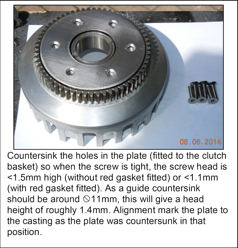 The cover can be welded on, or screwed on. Because I don’t have a very good welder I chose to screw my cover back on, as the cover is very thin and I would have ended up warping the crap out of it or destroying it all together. This required pressing out the old rivets (much easier said than done) and tapping new threads in the rivet hols. Because there is so little clearance between the back of the clutch basket and the engine case, I had to source ultra low head bolts to screw the cover back on. There is only space for 1.5mm of weld or bolt head to stick out from the cover.