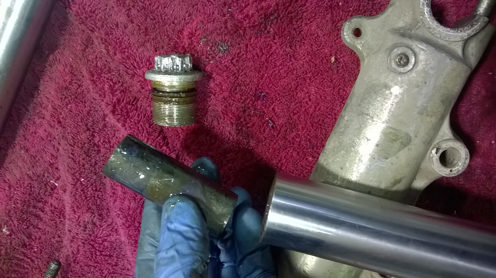 They also had the old cut off bit of pipe jammed down the top to compress the completely shagged fork springs to.