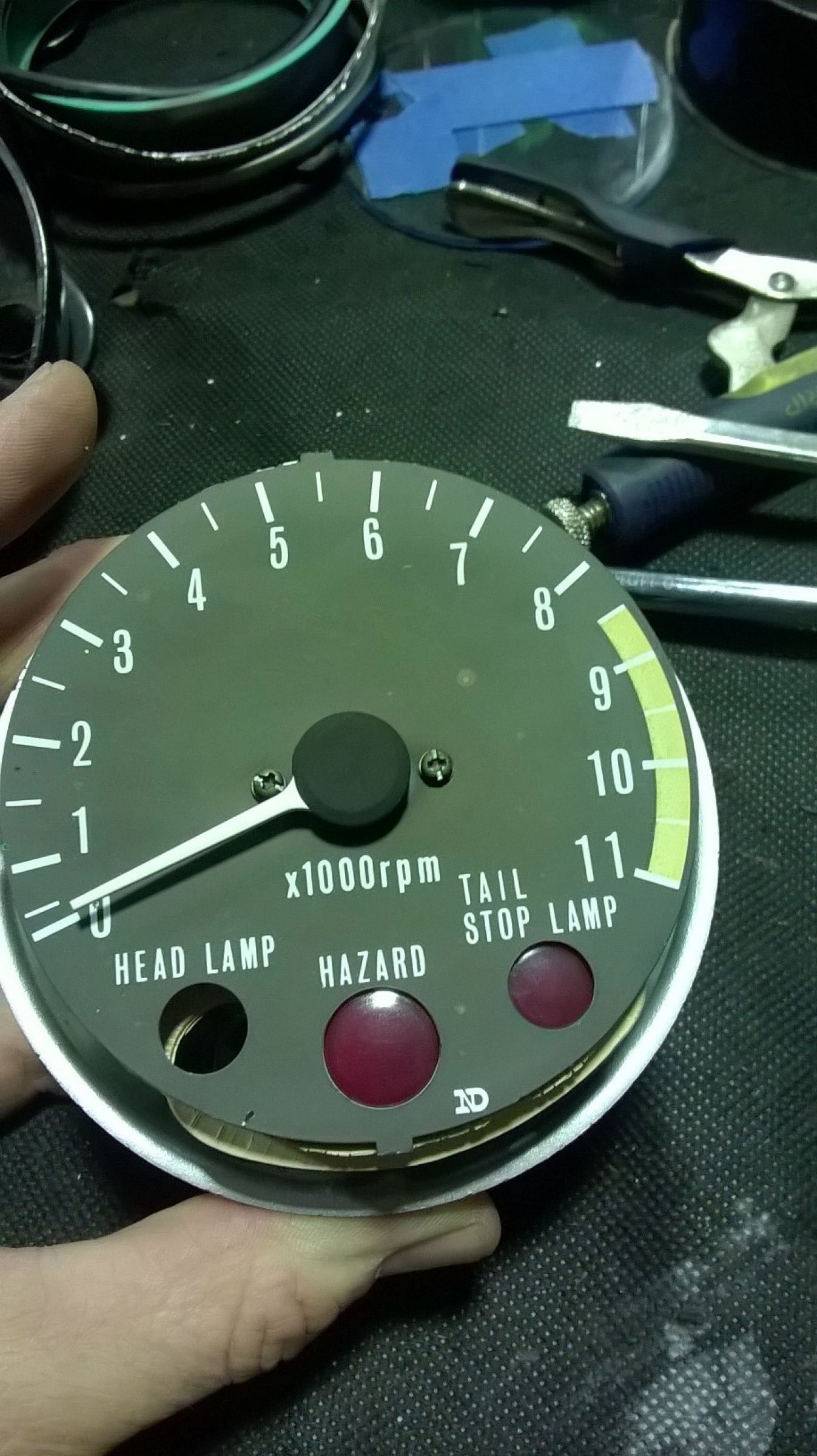 and finally...................................................I got back to the clocks. Pulled the tacho apart, bit like opening a tin of tomatoes really. The tacho face is very faded, especially where the red line is. I popped the dial off and will have a go at polishing it up and repainting the redline. If I fail miserably at that it might be time to look for a replacement face lol! Time will tell. Also started taping up gauges for sanding and painting,