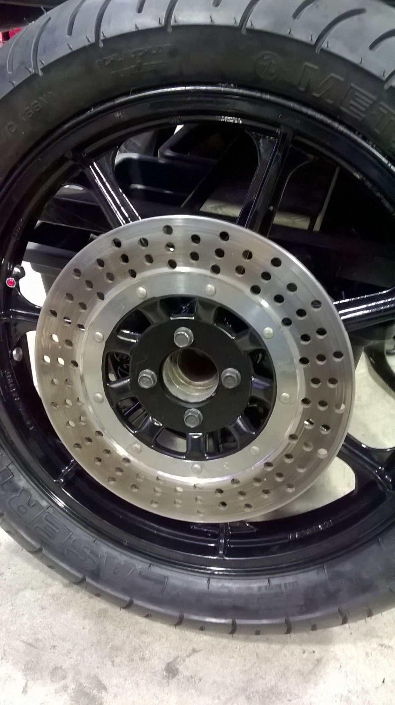 Started sorting out the disc rotors. Attacked the rear one first. Taped, sanded, and painted, then back on the rim. Job's done!