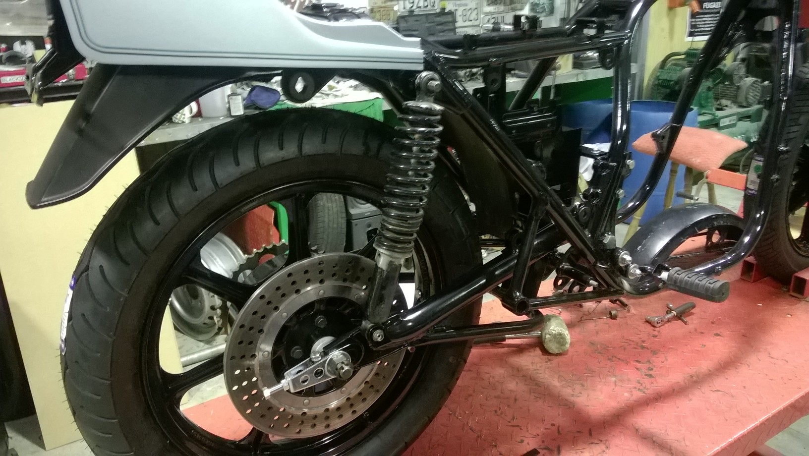Righto, still waiting on bits for the brakes so thought it was high time I put the battery box back in. I know I say this in every thread but man I love new bolts! Put the box in and it fits sweet and looks good with new rubbers and powder coat. Only bummer is that I now realise I am missing three of the parts that make up the battery box! :blink: On the hunt now for the missing bits so if you by any chance have any of these bits hiding in your shed please let me know! Also got the wheel adjusters back from being replated and that meant I can put in the back wheel! Oh yeah baby!!!! Rolling chasis, just need to get the back caliper sorted and I can bolt it all up properly and call it done. Oh yeah, put the sidestand on to, can't have a rolling chasis without a stand can we. Only issue here is the I have lots of springs from my spring box but none that fit. Bugger, off to Ebay Germany to see if I can track down a set of German model side stand springs :S