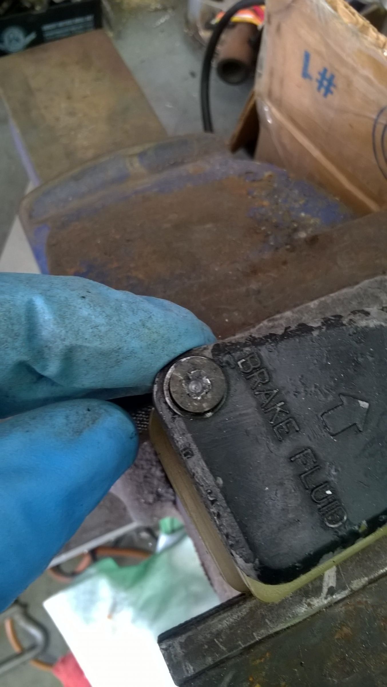 Had a bit of an issue getting the top off the front brake reservoir, had to resort to the drill and ezy out. Hate rounded off philip head bolts. When I finally got the top off I pulled out it's little condom looking thing and it was very buggered. God knows if you can still get one of those!! :ohmy: