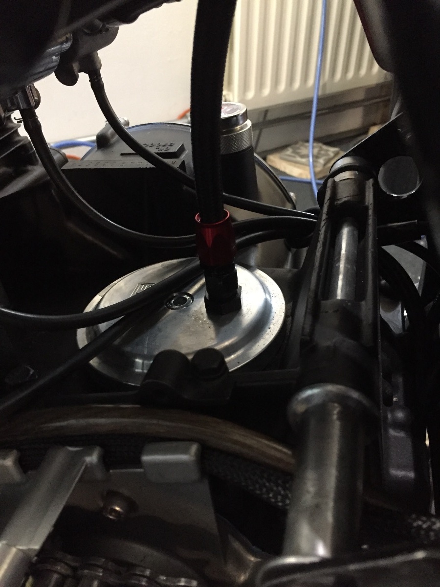 Removed the low "good looking" breather cap and replaced it with the stock high one.
