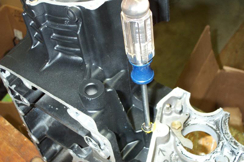 With the dowel out and MMF merrily boiling away inside the hole, the easy out was inserted and started gentle twisting commenced. At first It seemed too easy, as if the easy out out was just spinning in it's hole, and that perhaps the hole had been drilled too large, but then we realized the easy out was rising out of the hole. The bolt piece was just easily unscrewing! It seemed too easy & too simple, but soon the offending piece was out. This was taken after the dowel had been replaced, showing how much bolt was left in the hole.