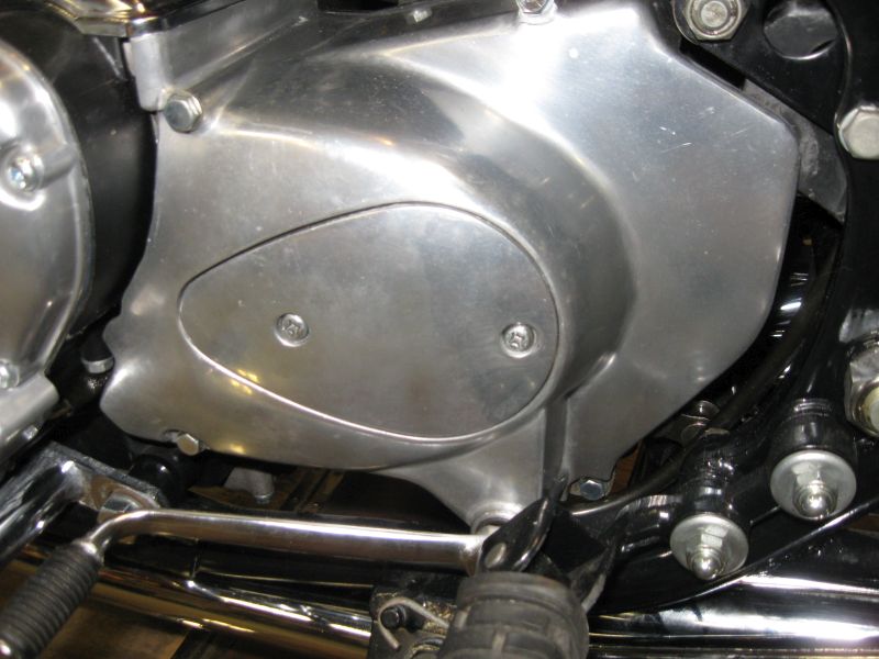 Countershaft cover without shift pattern. An operational chain oiler is underneath. We didn't try to remove every blemish from any of the polished aluminum. There is something to be said for leaving some patina of age. True all over the bike, in keeping with the very nice rider theme instead of concourse-quality resto.